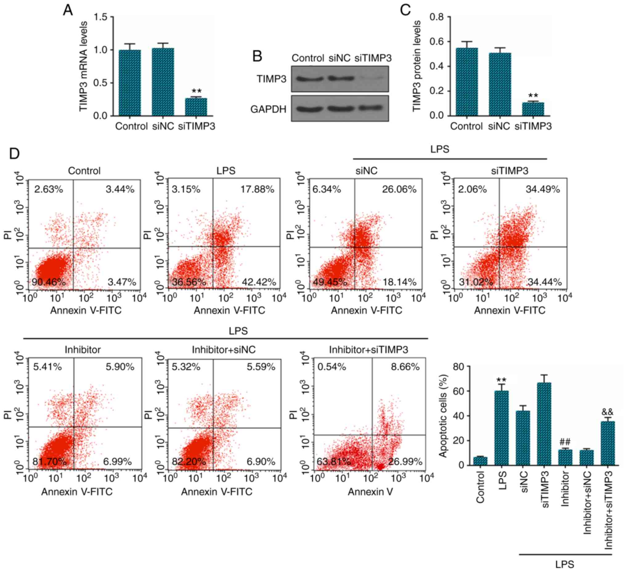 As the overexpression miR-222 decreased the TIMP3 levels in the LPS-stimulated NP cells, we then wished to determine whether TIMP3 is involved in the apoptosis of LPS-stimulated NP cells. The NC-siRNA and TIMP3-siRNA plasmids were transfected into the NP cells with/without miR-222 inhibitor and cell apoptosis was examined. The successful knockdown of TIMP3 was verified by RT-qPCR (Fig. 5A) and western blot analysis (Fig. 5B and C). We further analyzed the apoptosis of LPS-stimulated NP cells, and the results revealed that the decrease in the expression of TIMP3 effectively attenuated the inhibitory effects on the apoptosis of LPS-treated NP cells induced by miR-222 inhibition (Fig. 5D).