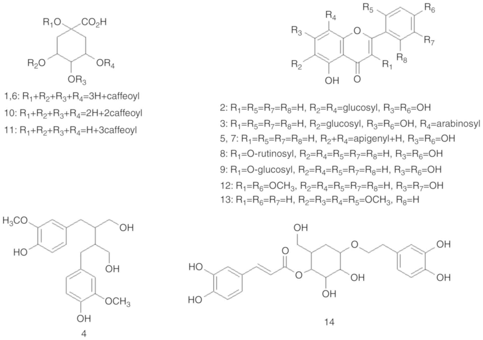 Among a number of components (fatty acid, amino acid, vitamin C, coumarins, glycosides, polyphenols, polyacetylenes, terpenes, sterols, sesquiterpene lactones and essential oils) identified from A. argyi (12,13). Polyphenols usually detected in plants can be classified into two groups of flavonoids and non-flavonoids, and may be notably responsible for various pharmacological activities (14). Polyphenols including flavo-noids serve a role as powerful anti-oxidants that are capable of scavenging reactive oxygen species, thereby suppressing the pathogenesis of age-related degenerative diseases, such as diabetes, cardiovascular disease, cancer, and neurodegenera-tive diseases (15,16). Scientists have been shown great interest in the study of plant flavonoids, as of their potential application in the fields of nutrition and pharmacology, where A. argyi could be an attractive research target (17).