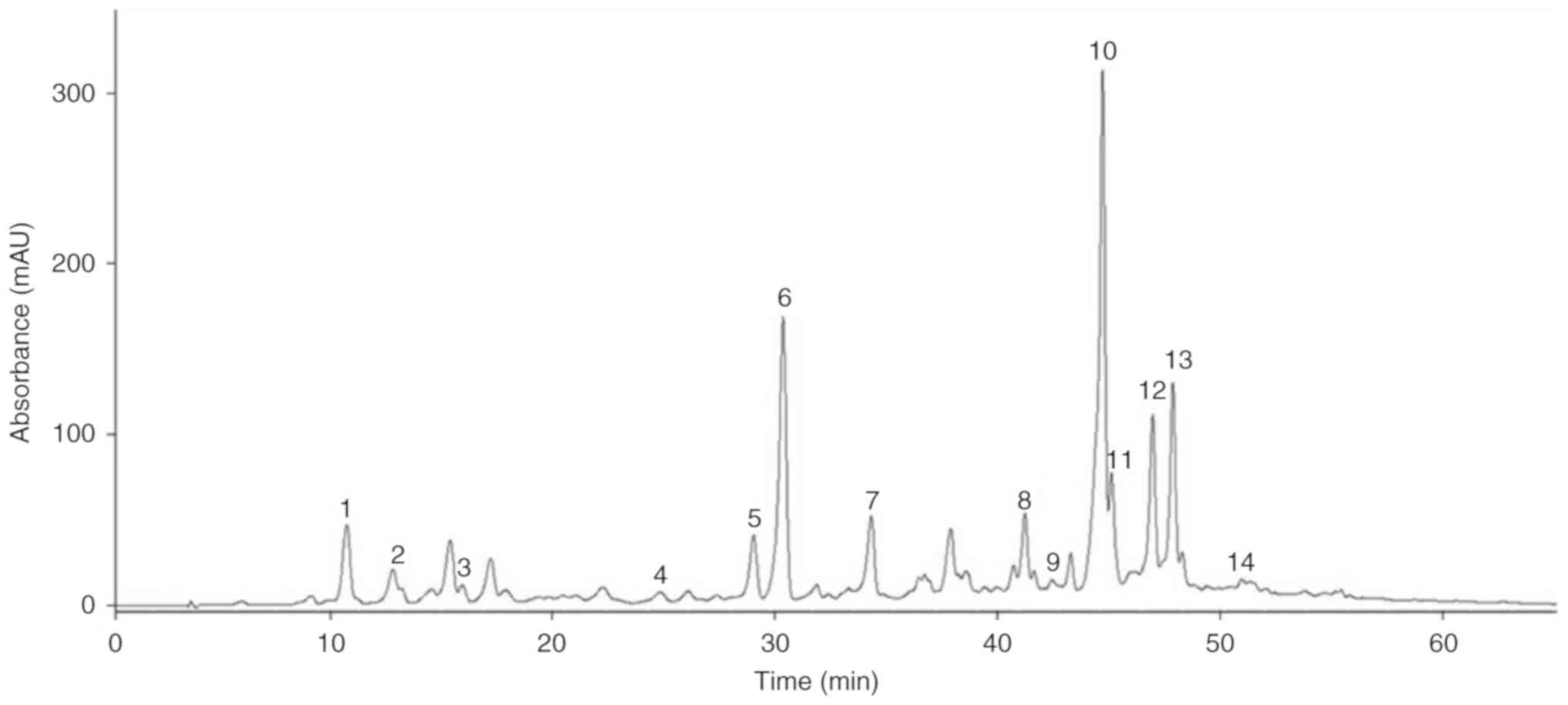 The mixture of polyphenols isolated from SM by 70% methanol extraction was followed by the elution of ethyl acetate over a silica gel column. Each polyphenol was characterized via HPLC using a C18 column, MS/MS in negative ion mode, and a comparison with the reported data was performed. The polyphenols were labeled according to their retention time (tR) order in the 10‑60 min absorbance segment of chromatogram recorded at 280 nm (Table I). A total of fourteen polyphenols were characterized, which are composed of five hydroxycinnamates (1, 6, 10, 11 and 14), eight flavonoids (2, 3, 5, 7, 8, 9, 12 and 13) and one lignan (4). As shown in Figs. 1 and 2, and Table I, the structures and HPLC‑ MS/MS data of the polyphenols were presented. Hydroxycinnamates (1, 6, 10, and 11) and flavonoids (2 and 3) were recently reported in Chinese and Korean A. argyi (33). To the best of our knowledge, we are the first to characterize one hydroxycinnamate (14), six flavonoids (5, 7, 8, 9, 12 and 13), and lignan (4) in the SM variety of A. argyi. It has been known that plant bioactive components may vary in accordance with the plant variety based on geographical location, which is attributed mainly to climatic variation and nutrient availability (12). The novel polyphenols were identified on the basis of their molecular ions and mass fragmentation patterns in comparison with the literature data. Thus, phenolic component 4 (tR=24.02 min) yield [M‑H]‑ at m/z 361, which was fragmented to ions m/z 346 [M‑H‑C H3]‑, 313 [M‑H‑C H2O]‑, 179 [C6H4(O)(OCH3)CH=CHCH2OH]‑, and 165 [C6H3(CO)2CH2CH2CH2Ox]‑, was identified as secoisolariciresinol (34). Flavonoid 5 (tR=28.70 min) was identified as amentoflavone isomer, which has shown [M‑H]‑ at m/z 537, and fragmented to generate an ion at m/z 443 [M‑H‑C 6H5OH]‑, 417 [C ring 0,2 cleavage, M‑H‑C 6H4(O)CO]‑, 399 [C' ring 0',3' cleavage, M‑H‑C 6H2(OH)2CO‑2H]‑, 375 [C ring 0,4 retro‑D iels Alder fragment, M‑H‑C 6H4(OH)C(O)CHCO]‑, 331 [M‑H‑(A' + C') rings‑C O]‑ and 117 [C6H4(OH)C=C]‑ (35). Flavonoid 7 (tR=34.17 min) was also identified as an amentoflavone isomer, which showed the similar fragmentation pattern [M‑H]‑ as flavonoid 5. Three amentoflavone type isomers (molecular weight=538, amentoflavone, robustaflavone and hinokiflavone) have been reported until now (36). However at present, it is unclear which of the three isomers should be assigned to 5 or 7, because the MS/MS data are not sufficient to exactly characterize the atomic connectivity of the isomers. Therefore, for exact identification and confirmation, further spectroscopic investigation should be performed. Flavonoid 8 (tR=41.69 min) yielded [M‑H]‑ at m/z 593 with additional peaks observed at m/z 447 [M‑H‑rhamnosyl]‑ and 285 [kampferol aglycon]‑, and this component was identified as kaempferol 3‑O‑rutinoside (37). Flavonoid 9 (tR=42.83 min) yielded [M‑H]‑ at m/z 461, and showed an additional fragmented peak at 285 [kampferol aglycon, M‑H‑glucuronyl]‑, which was identified as kaempferol-3-O-glucuronide (38). Flavonoid 12 (tR=46.49 min) yielded [M-H]- at m/z 329, which was fragmented to ions at m/z 314 [M-H-CH3]-, 299 [quercetin aglycon, M-H-2CH3 ]-, and 271 [quercetin aglycon-CO] -, and was identified as quercetin dimethyl ether (39). Flavonoid 13 (tR=48.12 min) was identified as skullcapflavone II, which showed [M-H]- at m/z 373, which was fragmented to generate an ion at m/z 358 [M-H-CH3]- and 343 [M-H-2CH3]- (40). Hydroxycinnamate (14) (tR=51.73 min) was identified as calce-larioside A, and its MS/MS showed [M-H]- at m/z 477, which was fragmented to 315 [M-H-caffeoyl]-, 179 [caffeic acid-H]- and 161 [glucosyl-H2O]- (41).