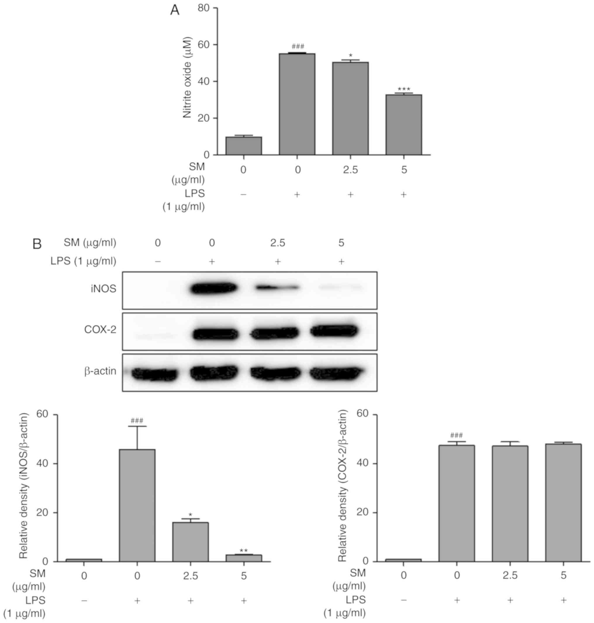 Nitric oxide synthases (NOSs) are composed of three types of enzyme (iNOS, endothelial NOS and neuronal NOS) that catalyze the production of NO from L-arginine (43). iNOS is involved in the immune response-like secretion of pro-inflammatory cytokines through the increased production of NO (43). NO radicals serve a crucial role in regulating inflammation and immune responses in asthma and inflammatory bowel diseases (44). In the process of inflammation, cellular NO is immediately oxidized to NO2- (45). As expected, treatment with SM polyphenols inhibited NO production in our study. In addition, the protein expression of iNOS was decreased, but no significant reduction in the expression level of COX-2 was observed by SM polyphenols in LPS-stimulated RAW 264.7 cells. This discordant result may be attributed to the degree of reliance of the transcription factors required for the expression of iNOS and COX-2 (46).