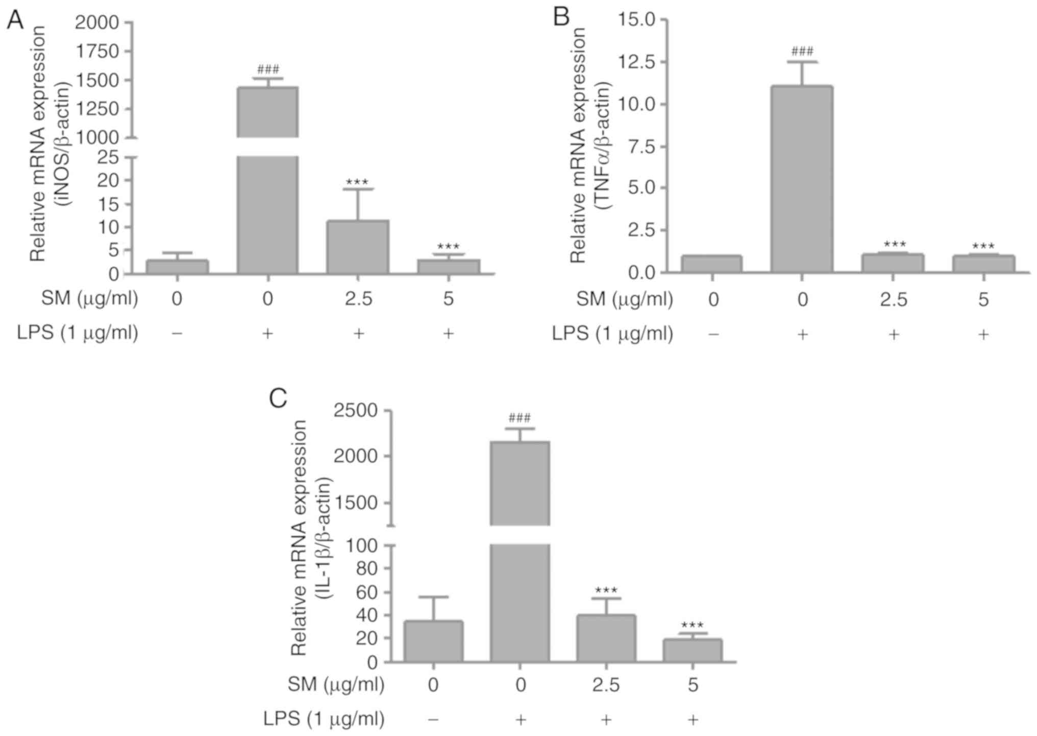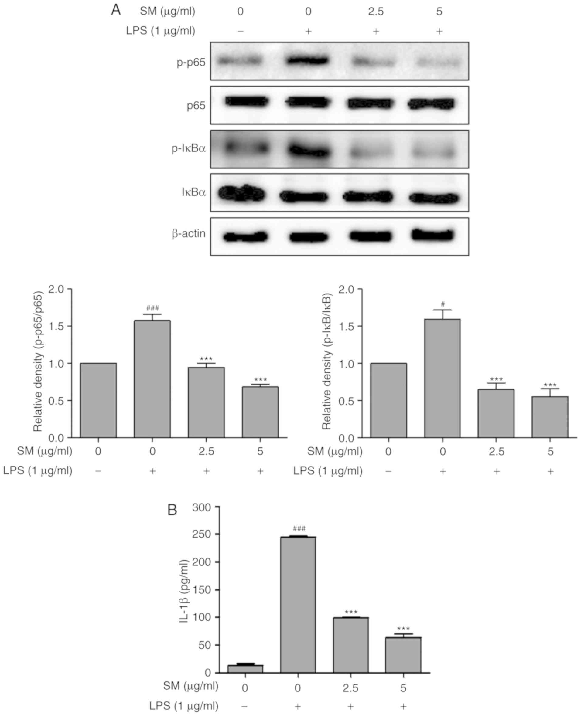 Activation of transcription factor NF-κB has been considered as the pivotal factor to regulate the expression of inflammatory enzymes and cytokines, such as iNOS, TNFα and IL-1β, which comprise the NF-κB binding sites in their promoters (47). Therefore, the proper regulation of NF-κB could be useful in the treatment of many inflammation-related disorders, such as allergies, cancer, dermatitis and arthritis (48-50). The activation of NF-κB and the increased mRNA levels of cytokines following LPS treatment were investigated by western blot and RT-qPCR analyses, respectively. The levels of IL-1β were measured using ELISA. SM polyphenols were observed to attenuate the upregulation of IL-1β, phosphory-lated NF-κB (p-p65 and p-IκBα), and increases in the mRNA expression of iNOS, TNFα and IL-1β in a dose-dependent manner. These results indicated that SM polyphenols effectively inhibit the NF-κB pathway, and the protein and mRNA expression of cytokines involved in the inflammatory process.