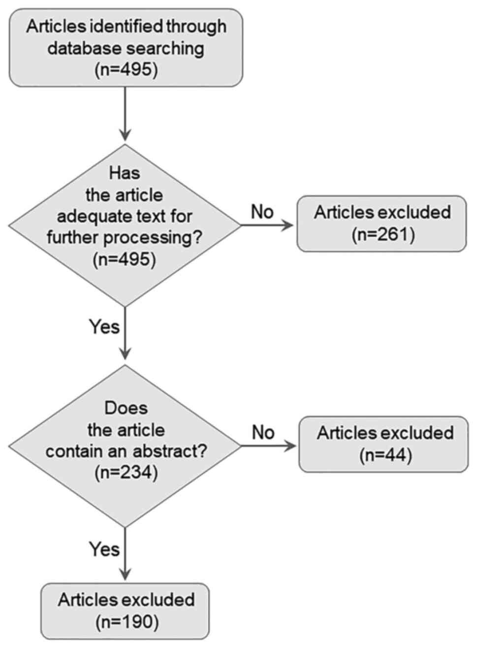 The scientific literature database, MEDLINE/PubMed (https://pubmed.ncbi.nlm.nih.gov/), was searched thoroughly for genes or gene products implicated in COVID-19 infection and VITT syndrome. Searches were conducted in the PubTator article collection (4) (https://www.ncbi.nlm.nih.gov/research/pubtator/) from the LitCovid database (5), using i) ('COVID19' OR 'SARS-CoV-2') AND ('VITT' OR 'vaccine-induced thrombotic thrombocytopenia'); ii) ('COVID19' OR 'SARS-CoV-2') AND ('thrombocytopenia' OR 'thrombopenia') key words to obtain relevant articles. Of the 495 candidate articles, 190 met the inclusion criteria which were as follows: i) written in English; ii) include an abstract; and iii) contain adequate information in their text for processing (Fig. 1).