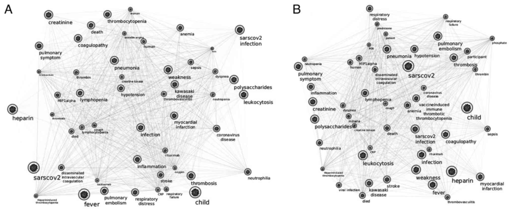 The constructed networks presented in Fig. 2 provide noteworthy information on how diverse terms are closely interlinked within the context of thrombocytopenia induced by SARS-CoV-2 infection or through vaccination. The term thrombocytopenia appears with a rather high frequency in the COVID-19/VITT network (Fig. 2A). Similarly, the term VITT is included in the COVID-19/thrombocytopenia network (Fig. 2B). COVID-19 and VITT share several comorbidities implicating vascular and epithelial dysfunction and thrombocytopenia. The nodes represent the top 50 words with a cosine similarity score of each word vector >0.9.