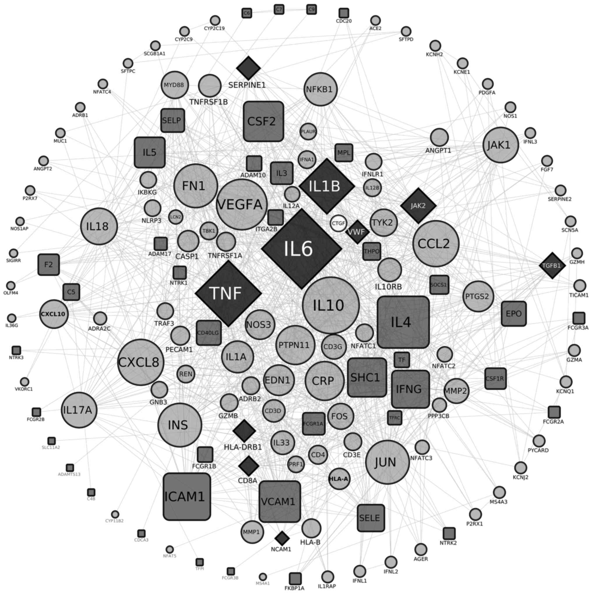 Subsequently, two interactomes were constructed: The first one involving 119 nodes is described in Table I and illustrated in Fig. 3. Collectively, 119 nodes are involved in COVID-19, while 57 are implicated in thrombocytopenia [the latter profits from an unpublished work of ours (unpublished data). Of these, 14 nodes were common in both entities (Figs. 3 and 4), namely AIM2, IFI16, NOD2, CD8A, IL-1B, 1L-6, JAK2, NCAM1, HLA-DRB1, SERPINE1, TGFB1, TLR2, TNF and VWF. The major hubs detected are displayed in the center of the constructed circular network, while the less connected nodes are shown at the periphery of the circle (Fig. 3). The thrombocytopenia-related nodes are represented in square bullets, and the COVID-19-related ones are presented in circles, whilst the common nodes are depicted in rhomboids. The calculated average node degree of the entire interactome was extremely high (11.9).