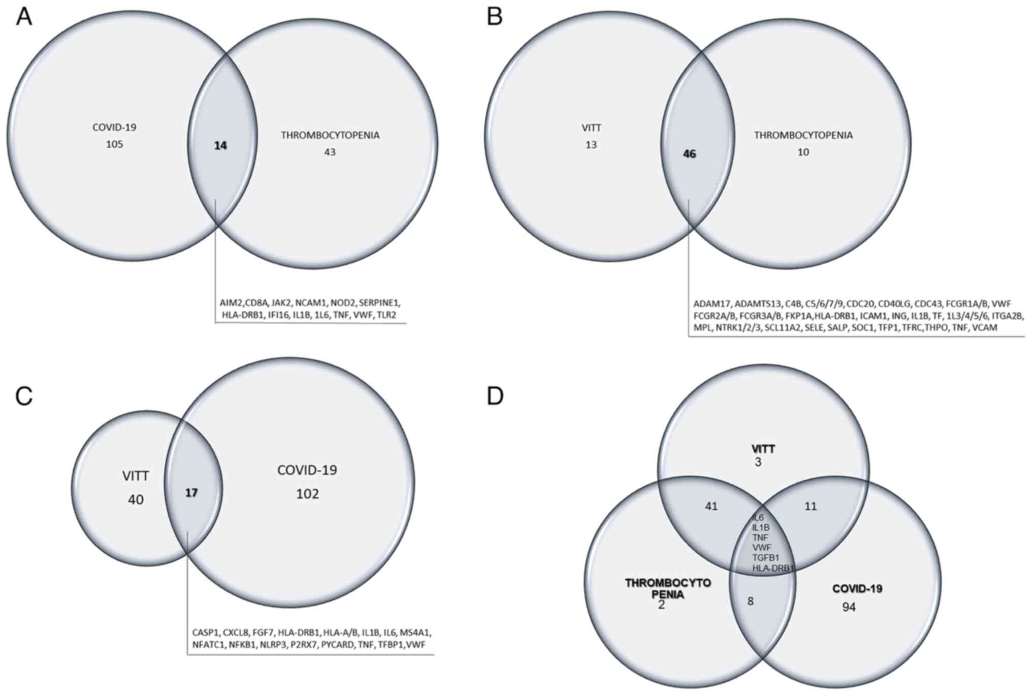 Venn diagrams were further created to illustrate the nodes that are common between thrombocytopenia and COVID-19 or VITT (Fig. 4A and B, respectively), between COVID-19 and VITT (Fig. 4C), and amid the three morbid entities (Fig. 4D). The common nodes are listed in each diagram in detail.