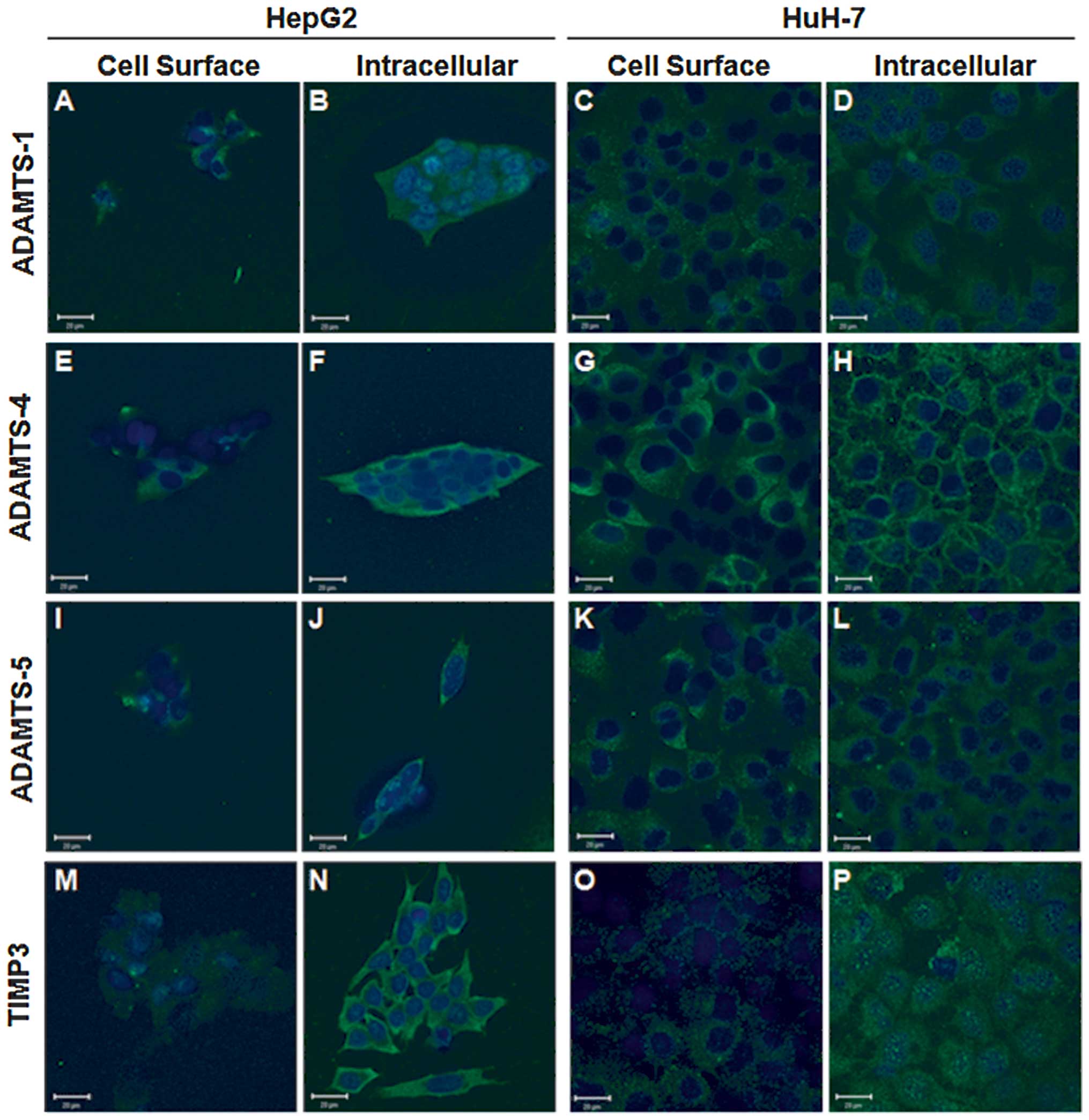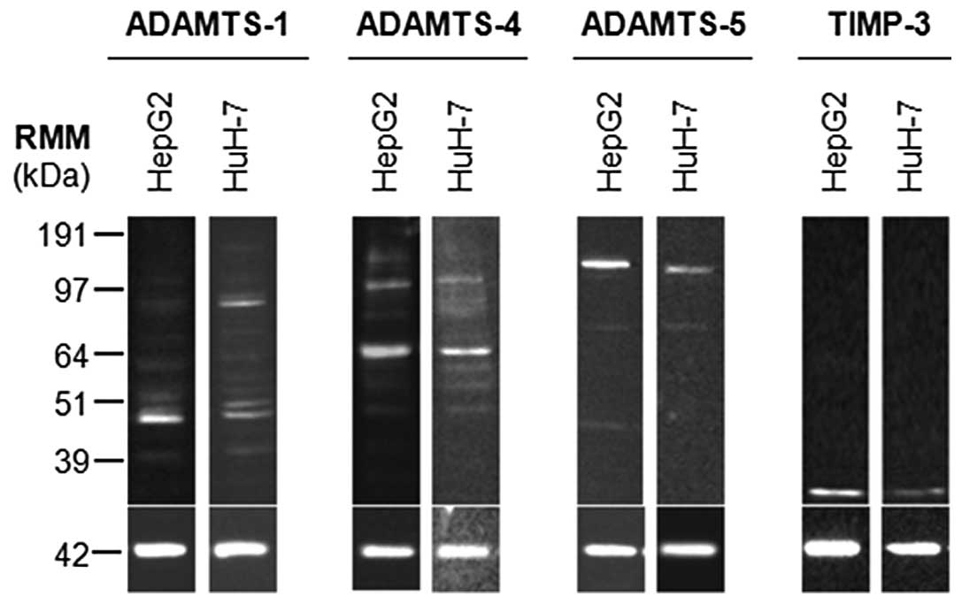 This study showed for the first time that ADAMTS-1, -4 and -5 proteins, and their major endogenous inhibitor TIMP3, are expressed in the HCC cell lines HepG2 and HuH-7.