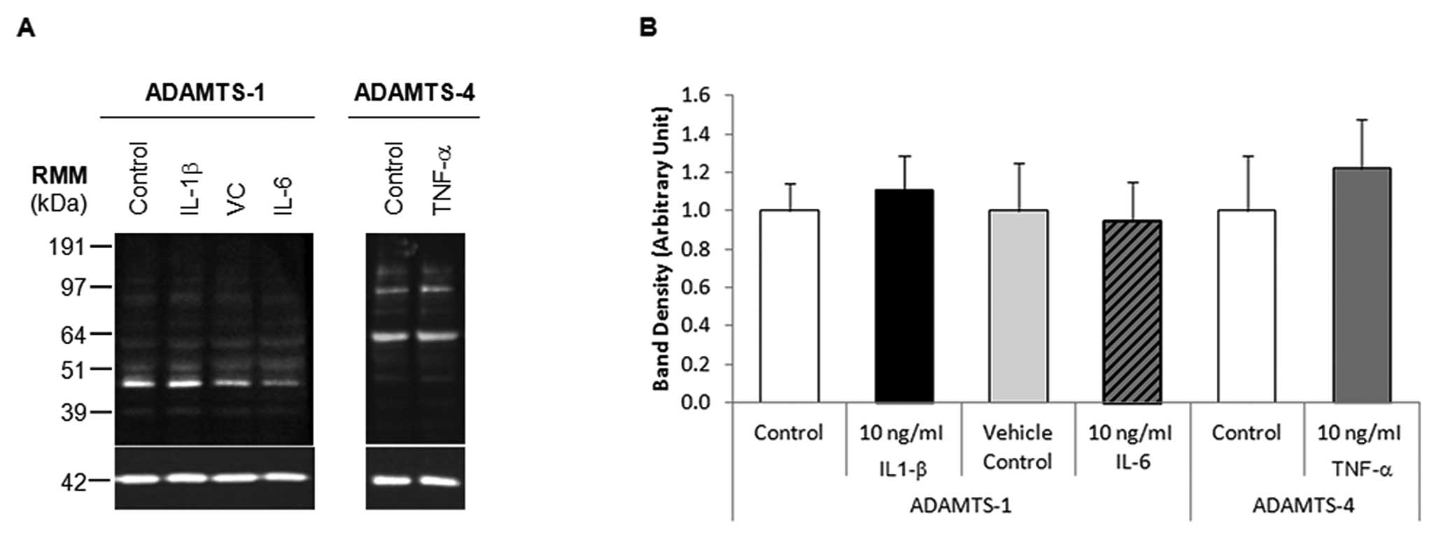 Studies on protein levels revealed that there was no ADAMTS-1 protein modulation following 24 h of IL-1β or IL-6 treatment, and no ADAMTS-4 protein modulation following 24 h of TNF-α treatment, as determined by western blotting and densitometry analysis. These enzymes were selected for investigation of modulation of protein levels as considerable changes at the mRNA levels had been observed.