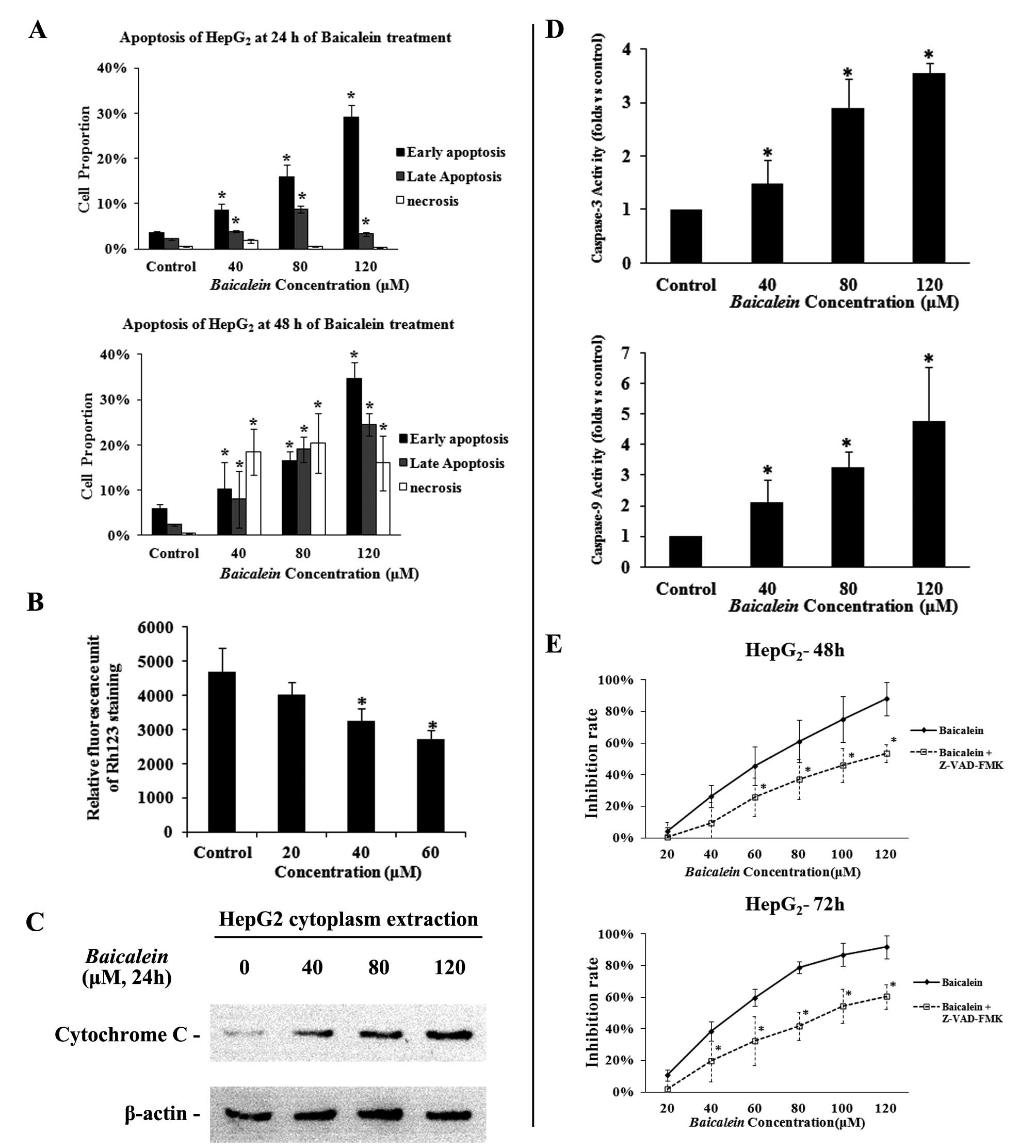 To further determine whether apoptosis induced by Baicalein was a mitochondrial-dependent pathway, we tested whether cytochrome c could be released from the mitochondria into the cytoplasm. As shown in Fig. 3C, levels of cytochrome c release from the mitochondria increased dose-dependently in the Baicalein-treated HepG2 cells at concentrations ranging from 40 to 120 μM. To further investigate whether apoptosis induced by Baicalein was a caspase-dependent pathway, we tested whether mitochondrial-related caspases were activated by Baicalein treatment. Our research showed that caspase-9 and caspase-3 activities were highly increased dose-dependently on exposure to Baicalein in HepG2 cells (Fig. 3E). Furthermore, we treated HepG2 cells with Baicalein in the presence of 10 M pan-caspase inhibitor (z-VAD-fmk) or DMSO (as a control). MTT assay showed that z-VAD-fmk partially attenuated Baicalein-induced inhibition on HepG2 cells (Fig. 3D), suggesting that apoptosis induction is an important cause for Baicalein-induced growth inhibition in HCC.
