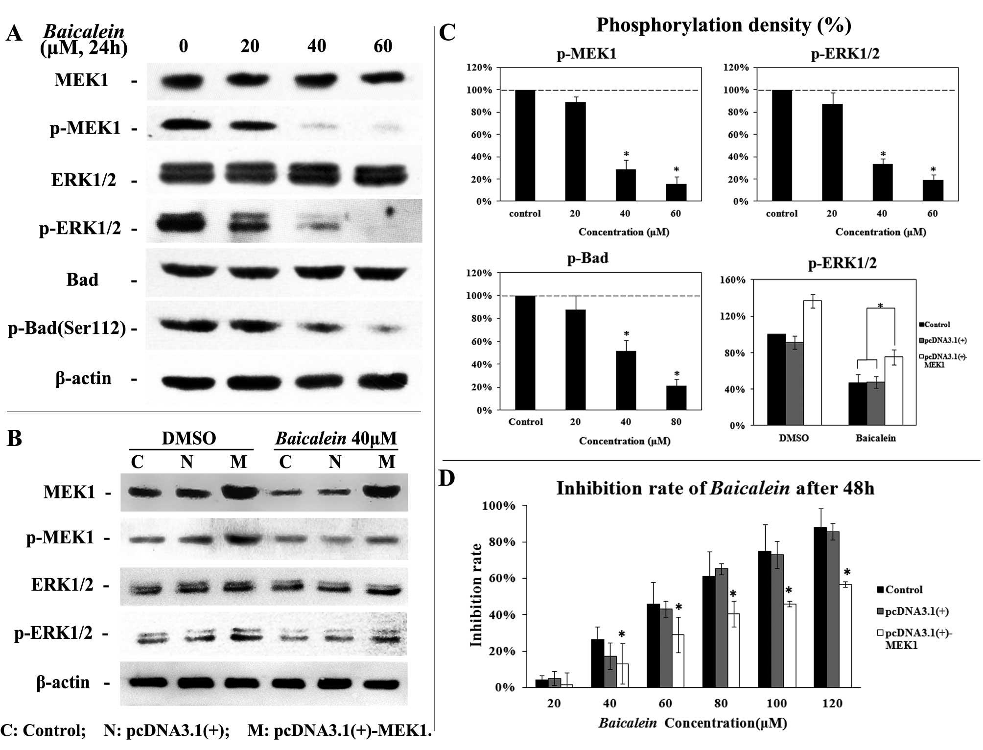 Baicalein was purchased from Sigma-Aldrich Co. (St. Louis, MO, USA). Dulbecco’s modified Eagle’s medium (DMEM) was purchased from Invitrogen (Carlsbad, CA, USA). Fetal bovine serum (FBS), penicillin, and streptomycin were ordered from Gibco-BRL (Rockville, MD, USA). The apoptosis detection kit was from Nanjing KeyGen Biotech. Co. Ltd. (Nanjing, China). MTT (3-(4,5-dimethyl-2-thiazole)-2,5-diphenyltetrazolium bromide) was purchased from Sigma Chemicals Co. (St. Louis, MO, USA). Caspase inhibitor z-VAD-fmk and anti-cytochrome c were purchased from Beyotime (Haimen, China), anti-MEK1 and anti-Phospho-MEK1 (Thr386) anti-Phospho (Thr386) MEK1 (p-MEK1) were from Millipore Co. (Billerica, MA, USA). Anti-ERK1/2, anti-Phospho (Thr202/Tyr204) ERK1/2 (p-ERK1/2), anti-Phospho-MEK1/2 (p-MEK1/2), anti-caspase-3, anti-Bad and anti-Phospho-Bad(Ser112) antibodies were purchased from Cell Signaling Technology Inc. (Danvers, MA, USA).