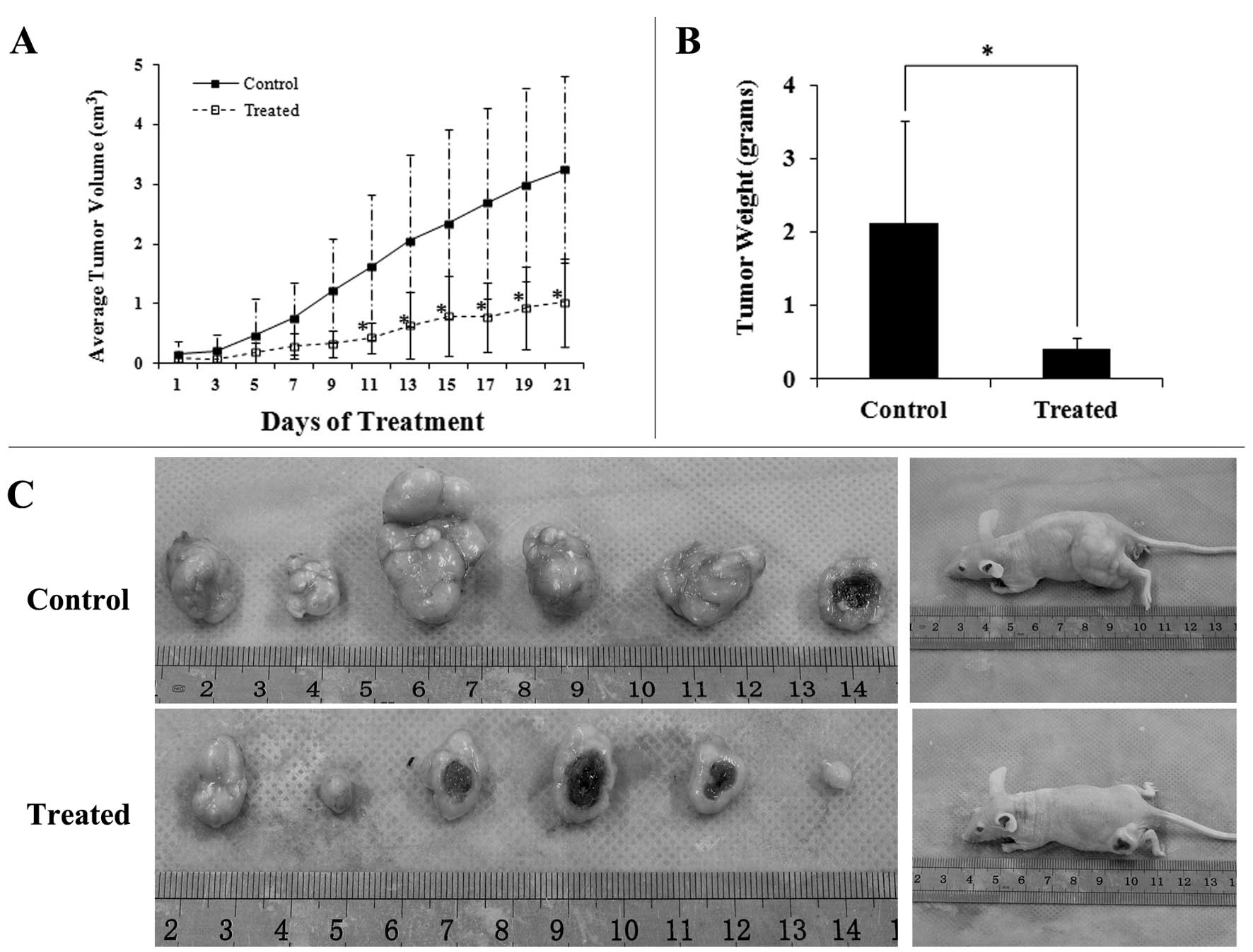 In the animal study, the control group received diluent vehicle treatment only, whereas the treatment group received Baicalein 20 mg/kg/day. This in vivo dosage was selected by our pilot experiments that showed significant tumor inhibition but without significant side effects. The mice were treated with Baicalein daily for 21 days. As shown in Fig. 5A, Baicalein-treated mice exhibited a statistically significant tumor volume reduction (p<0.01) compared with the control group. The average tumor volume of control and treatment group were 3.25±0.56 cm3 and 1.02±0.40 cm3, respectively. After treatment for 21 days, the mice were sacrificed, xenograft tumors were resected and the tumor weight of xenograft were measured. As shown in Fig. 5B and 5C, tumor sizes and weights in Baicalein-treated mice were dramatically smaller than those in control-treated mice. The control-treated mice had a median tumor weight of 2.12 g, whereas the Baicalein-treated mice had a median tumor weights of 0.41 g (Fig. 5B).
