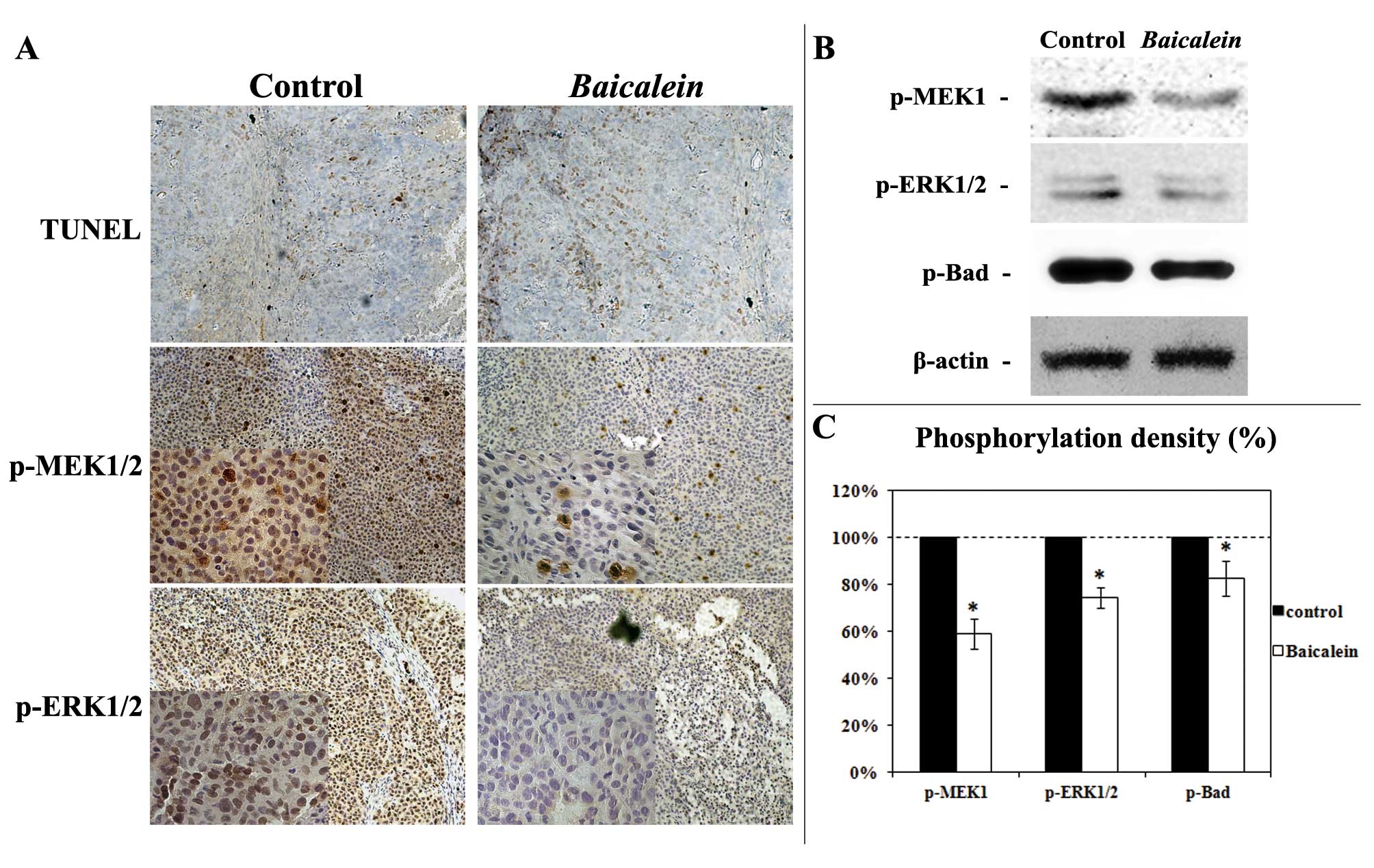 In order to confirm the in vitro observation of Baicalein-induced apoptosis (Fig. 3), Baicalein-induced apoptosis in xenograft tumors was evaluated with the terminal deoxynucleotidyl transferase dUTP nick end labeling (TUNEL) assay. As shown in Fig. 6A, Baicalein-treated tumors had greater TUNEL-postive cells than control-treated tumors. In agreement with the in vitro observations, p-MEK1/2 and p-ERK1/2 expression were markedly inhibited in Baicalein-treated tumors as illustrated by immunohistochemical analysis (Fig. 6A) and western blot analysis (Fig. 6B and 6C). MEK-ERK signaling associated Bad phosphorylation (Serine 112) was also decreased by Baicalein treatment (Fig. 6B and 6C). Above data confirm the in vitro results and show that Baicalein treatment can significantly suppress HCC tumor growth and MEK-ERK signaling, and can induce apoptosis in vivo.