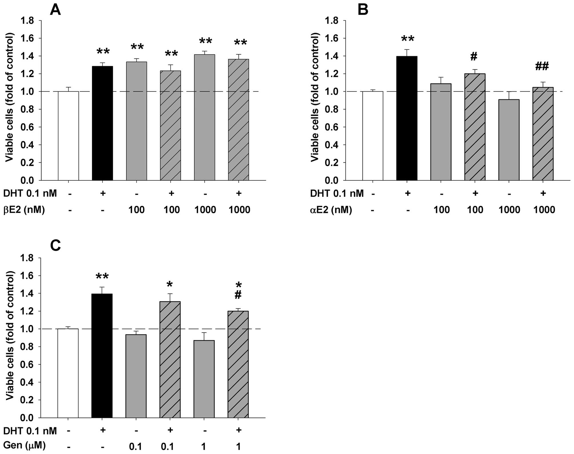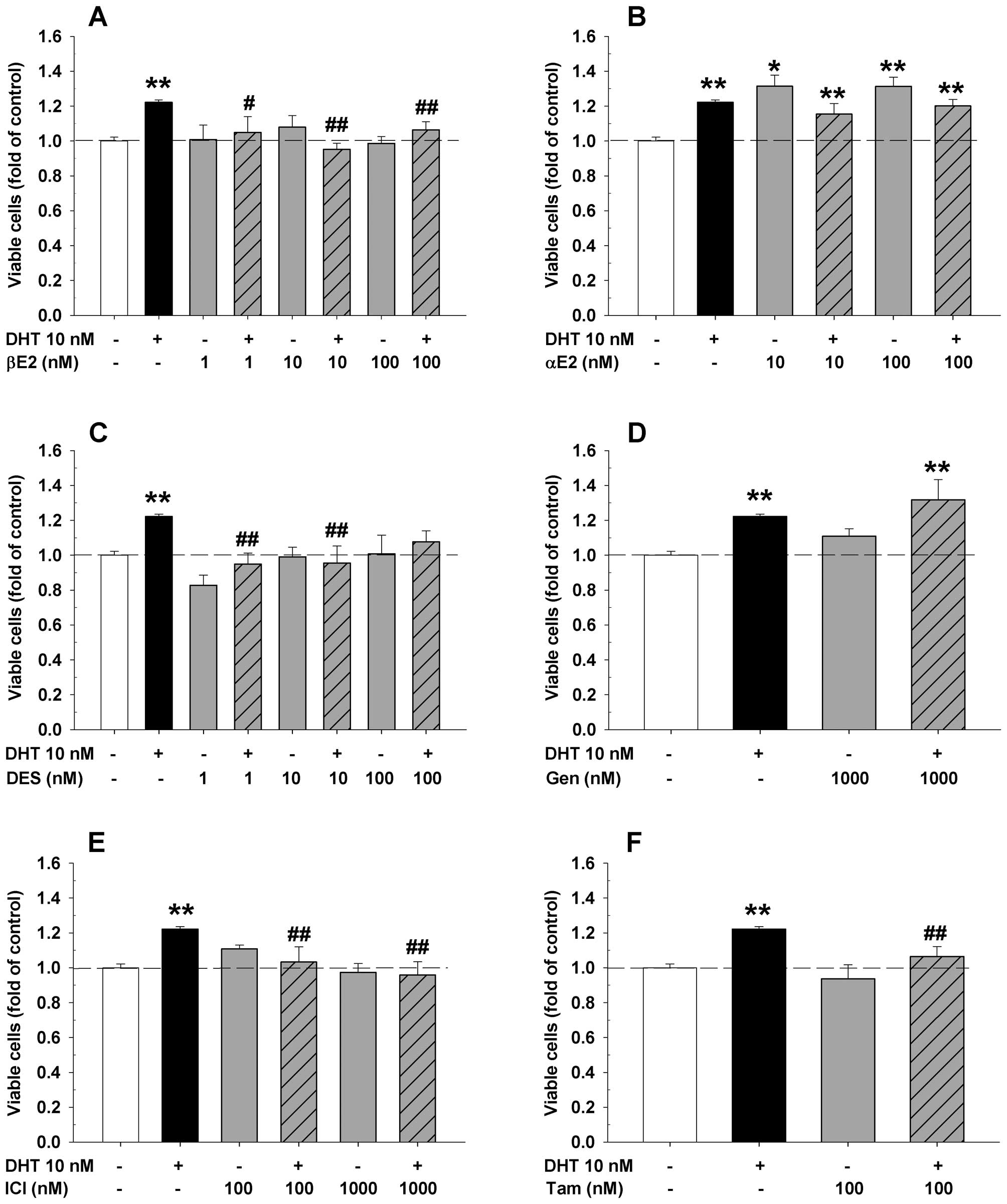 To determine the effects of various ER ligands on the regulation of DHT-induced cell proliferation in endothelial and prostate cancer cells, endothelial HAECs or prostate cancer cells were seeded in 96-well plates and treated with DHT plus or minus various concentrations of αE2, βE2, DES, ICI, genistein, and tamoxifen (Figs. 1–3) for 48 or 72 h, respectively. As shown in Figs. 1 and 2, treatment with βE2, DES, genistein or tamoxifen alone did not significantly affect the cell proliferation of both endothelial HAECs (Fig. 1) and prostate cancer LAPC-4 cells (Fig. 2). However, administration of αE2 significantly increased cell proliferation in HAEC cells (Fig. 1B), but did not have any effect in LAPC-4 cells (Fig. 2B). Treatment with ICI alone did not significantly affect HAEC cell proliferation (Fig. 1E), but decreased LAPC-4 cell proliferation in a dose-dependent manner (Fig. 2E). In LNCaP prostate cancer cells, treatment with either αE2 or genistein alone did not affect the cell proliferation (Fig. 3B and C), while βE2 significantly increased the viable cell number (Fig. 3A).