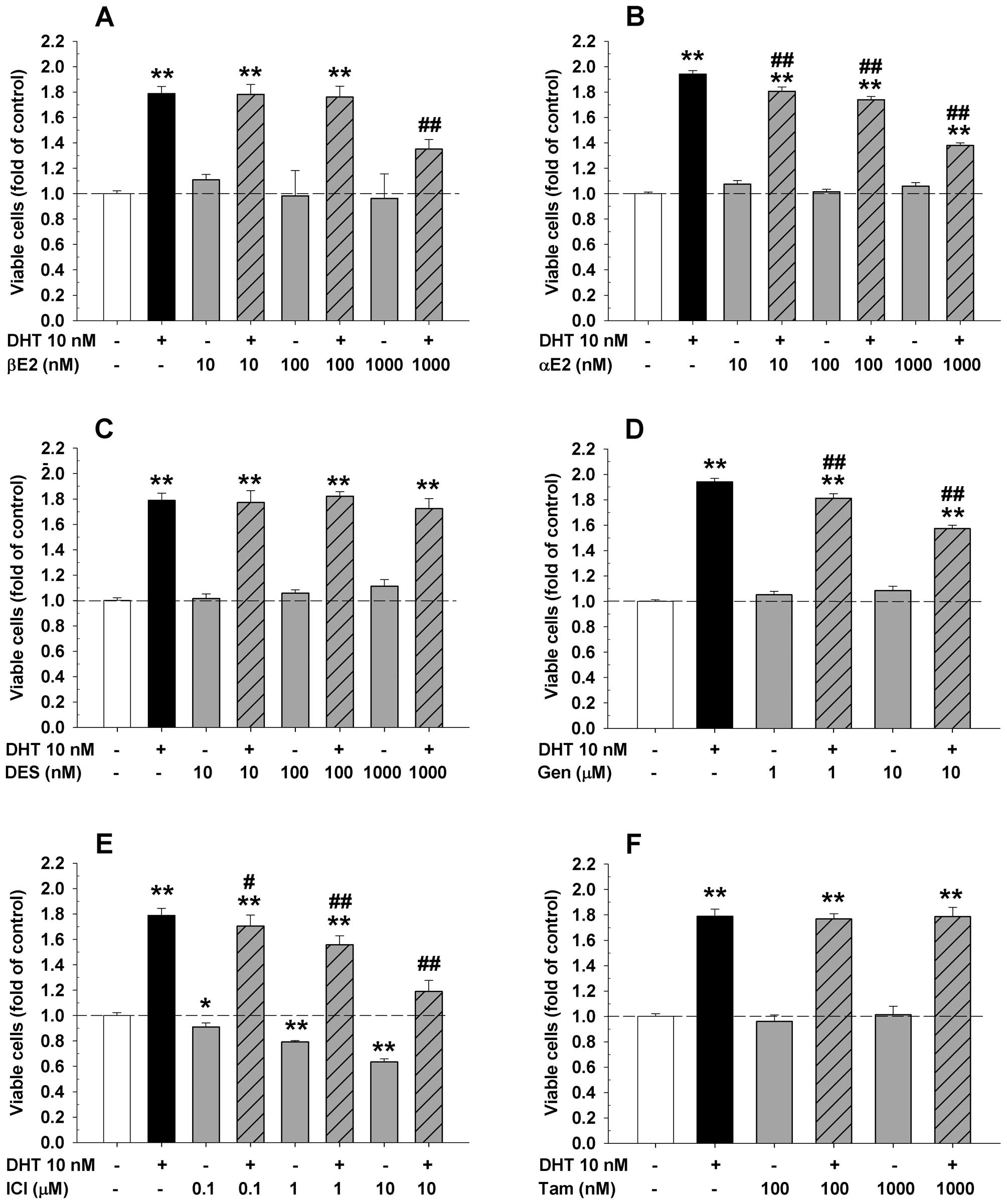 Dihydrotestosterone (DHT), 17β-estradiol (βE2), 17α-estradiol (αE2), diethylstilbestrol (DES), genistein and tamoxifen were purchased from Sigma Co. (St. Louis, MO, USA) and dissolved in absolute ethanol at 10−2 M stock solutions. 4,4′,4″-(4-Propyl-[1H]-pyrazole-1,3,5-triyl) trisphenol (PPT) and diarylpropionitrile (DPN) were obtained from Tocris Bioscences (Minneapolis, MN, USA). ICI182780 (ICI), a pure estrogen antagonist, was kindly provided by Dr A.E. Wakeling of Zeneca Pharmaceuticals (Macclesfield, UK). Reagents for real-time PCR were purchased from Invitrogen (Carlsbad, CA, USA). Antibodies against ERα (HC-20: sc-543) and ERβ (N-19: SC-6820) were obtained from Santa Cruz Biotechnology (Santa Cruz, CA, USA) and antibodies against cyclin A (cat no. C4710) and β-actin (cat no. A5316) were obtained from Sigma Co.