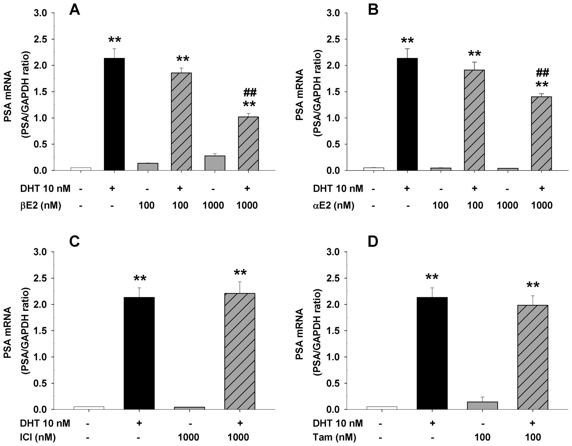 Co-administration of ER ligands also produced a ligand-specific modulation of DHT-induced PSA expression in LAPC-4 cells (Fig. 4), consistent with our previous studies (7,24). Specifically, the DHT-induced PSA mRNA expression in LAPC-4 cells was significantly inhibited by αE2 and βE2 (Fig. 4A and B) but not by ICI or tamoxifen at the doses tested (Fig. 4C and D).