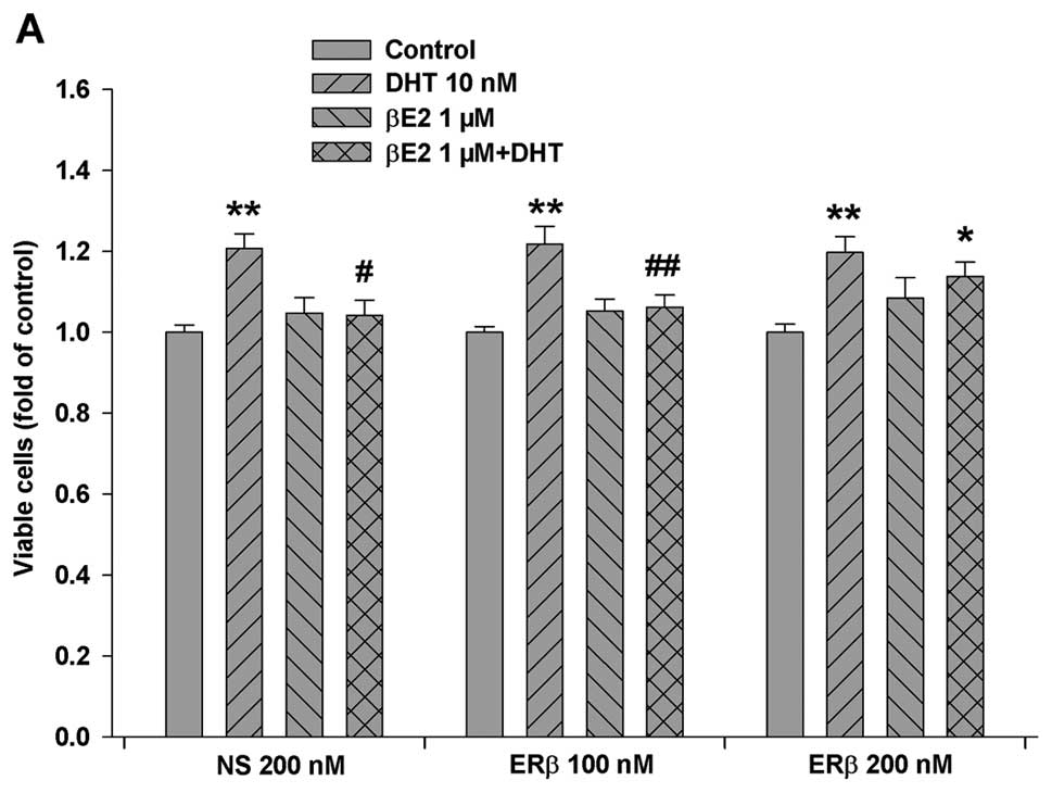Based on this information, we knocked down ERβ expression in LAPC-4 cells by transfection of a specific ERβ siRNA. As shown in Fig. 6, transfection of a specific ERβ siRNA produced a dose-dependent decrease in ERβ protein expression, and the knockdown of ERβ partially eliminated the βE2 inhibition of DHT-induced cell proliferation in LAPC-4 cells (Fig. 6A).