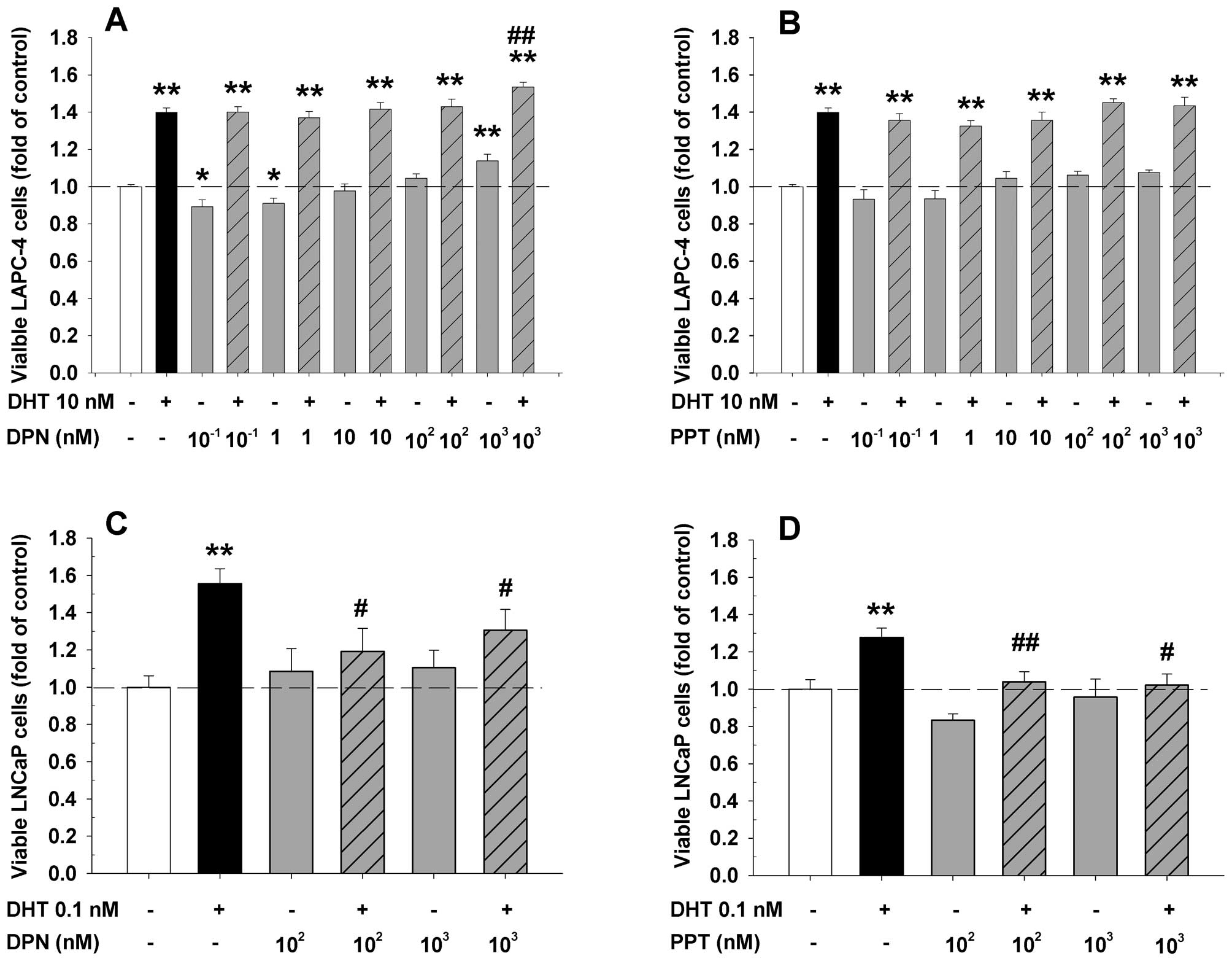 To explore whether a specific activation of ERβ is sufficient to inhibit DHT-induced LAPC-4 cell proliferation, the cells were treated with DHT plus or minus a specific ERα or ERβ agonist. As expected, the addition of an ERα specific agonist, PPT, failed to affect the DHT-induced cell proliferation at the doses ranging from 0.1 to 1,000 nM (Fig. 7B). Surprisingly, the concomitant administration of an ERβ specific agonist, DPN, did not inhibit the DHT action while it slightly but significantly potentiated DHT-induced cell proliferation at a 1 μM dose (Fig. 7A). Of note, treatment with DPN alone produced a dose-dependent biphasic effect in LAPC-4 cells. At low doses from 0.1 to 1 nM, it slightly but significantly decreased cell proliferation while at a high dose of 1 μM, it significantly increased cell proliferation (Fig. 7A). In contrast, both PPT and DPN at doses of 100 nM and 1 μM completely blocked DHT-induced cell proliferation in LNCaP cells as shown in Fig. 7C and D. Treatment with PPT or DPN alone did not significantly alter the cell proliferation in LNCaP cells.