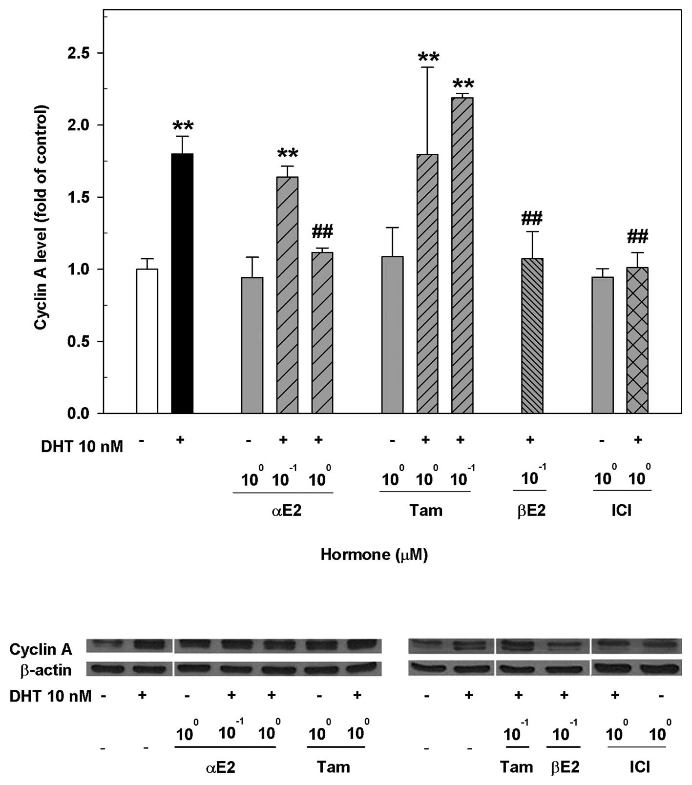 Previous studies demonstrate that cyclin A expression is induced by DHT, which is related to DHT-induced cell proliferation in both HAECs (25) and LAPC-4 cells (6). To decipher the possible molecular events responsible for the differential effects of ER ligands on the modulation of DHT-induced cell proliferation in LAPC-4 cells, we assessed the cyclin A expression after treating LAPC-4 cells with DHT and various ER ligands alone or in combination. As shown in Fig. 8, treatment of LAPC-4 cells with 10 nM DHT for 72 h significantly upregulated the expression of cyclin A. This DHT effect was significantly attenuated by the co-administration of αE2, βE2 or ICI, but not by tamoxifen at the doses used, resulting in changes parallel to the modulation of DHT-induced LAPC-4 cell proliferation (Fig. 2).