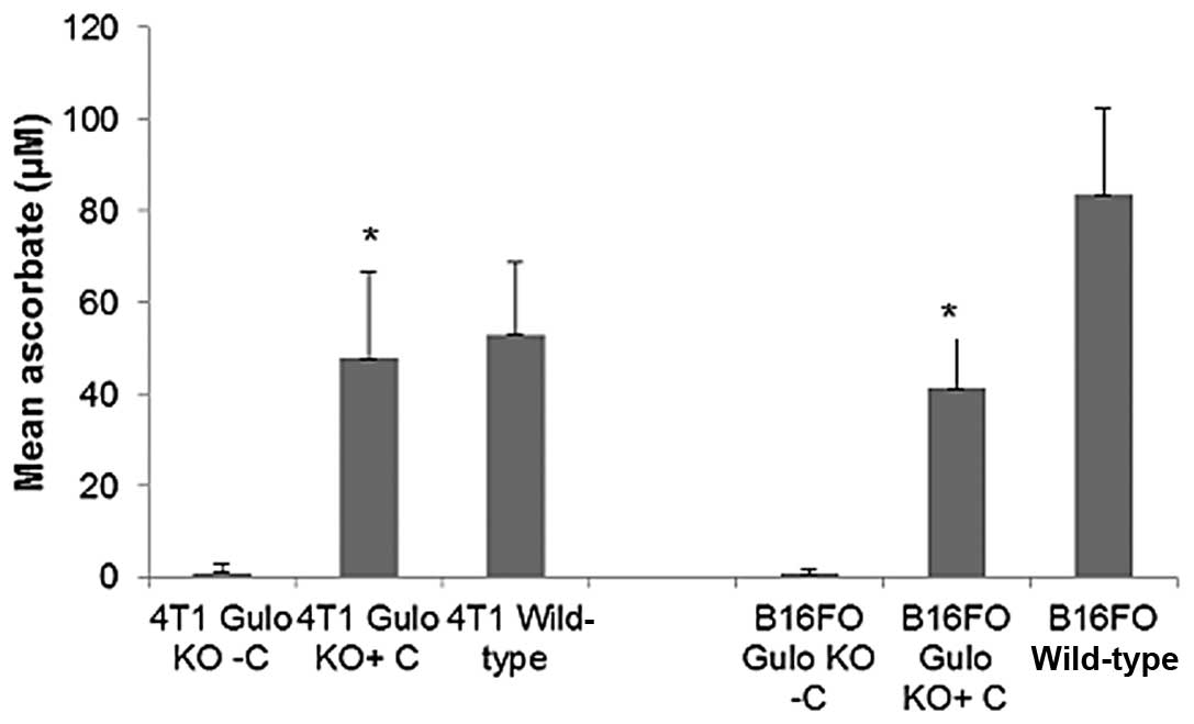 Mean ascorbate level was slightly higher in wild mice compared to supplemented gulo KO mice in the 4T1 study and significantly higher in the B16FO study. The higher ascorbate levels in wild-type mice are probably due to the age difference between gulo KO and wild-type mice. In addition, younger (3 months old) Balb/c mice have been reported to grow significantly larger tumors than older (9+ months old) mice (36). These findings would probably explain the higher metastasis grade and larger tumor weight observed with the wild-type mice compared to the supplemented gulo KO mice. Though this was not the focus of the study, the use of wild-type reference mice that were considerably younger (by 6 months) than the experimental set was a limitation. In a previous study of B16FO growth/metastasis using wild-type and gulo KO groups of mice both approximately 36–40 weeks of age, no statistical difference was observed between tumor growth in wild-type and supplemented gulo KO mice (37).