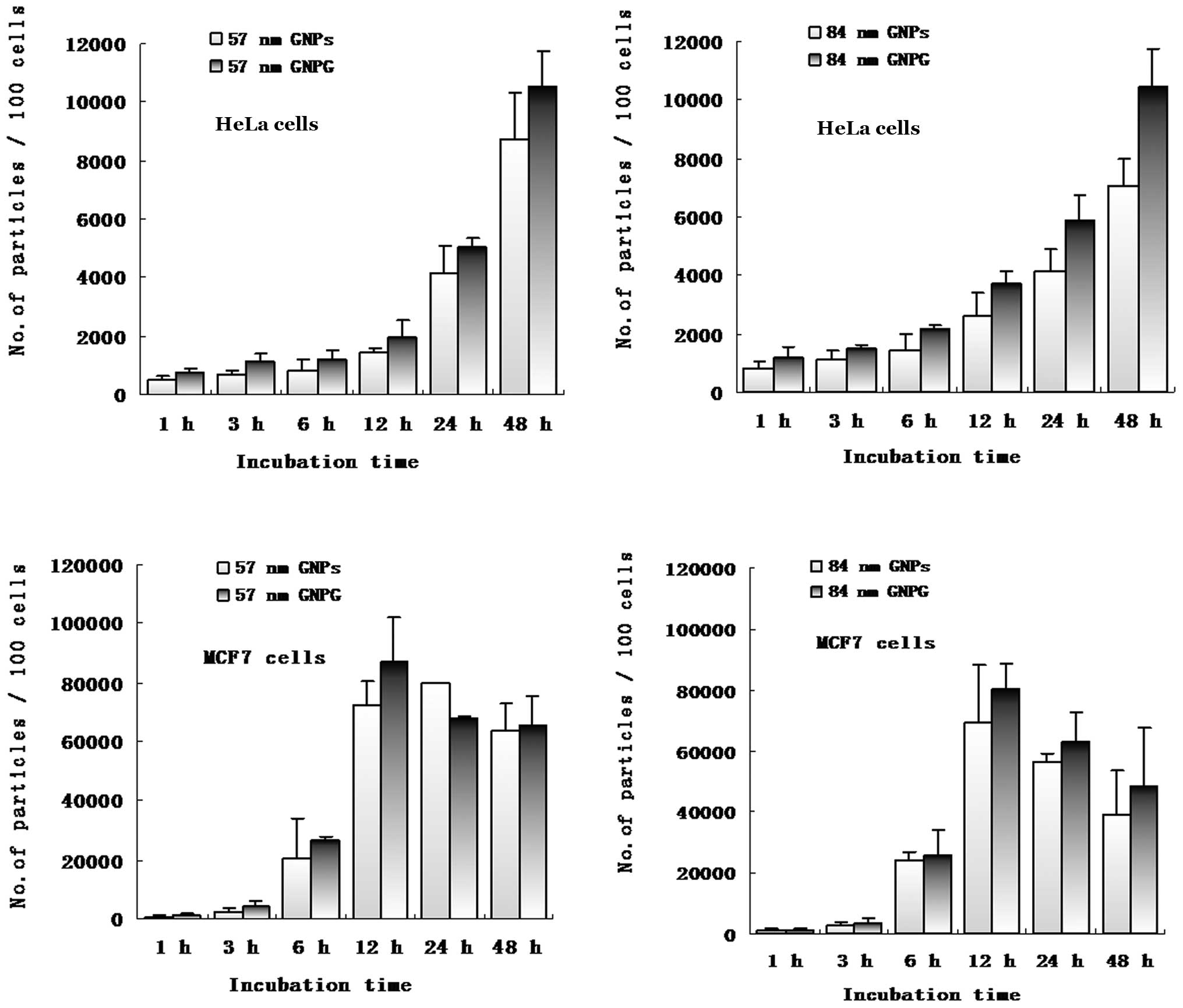 In this study, more 57-nm particles were taken up by the HeLa and MCF-7 cells than 84-nm nanoparticles regardless of whether glucose was capped on the GNPs or not. This result is partially in line with the results of the study by Chithrani et al, and the result confirms that 50 nm is the best choice for gold-based nanoparticles for tumor diagnosis and treatment (8,9). However, we are the first group to illustrate that the Glu-GNP uptake by cells is also size-dependent and that the optimal size is 57 nm instead of 84 nm. Based on our results, the nanoparticle size is critical for biomedical applications regardless of whether the surface of the nanoparticles is modified or not.