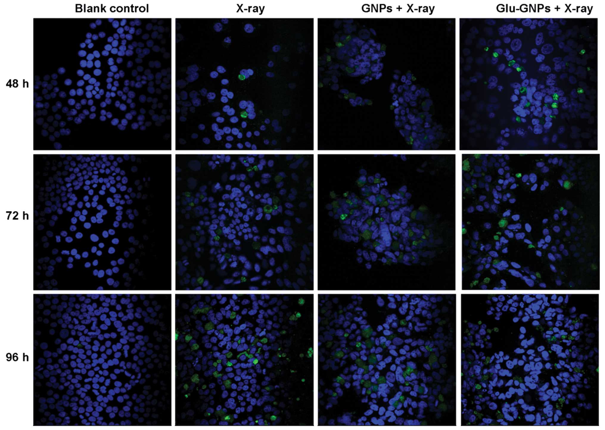 The TUNEL method can be used to label the fragmented DNAs inside cells, which is a characteristic method for determining apoptosis. As shown in Fig. 7, X-rays clearly induced apoptosis compared to the blank controls. The size of TUNEL-positive nuclei tended to increase as incubation time increased (48, 72 and 96 h) after X-ray treatment. There was no significant difference among cells only treated with X-ray alone or nanoparticles without X-ray irradiation. The results are in line with our flow cytometry analysis results.