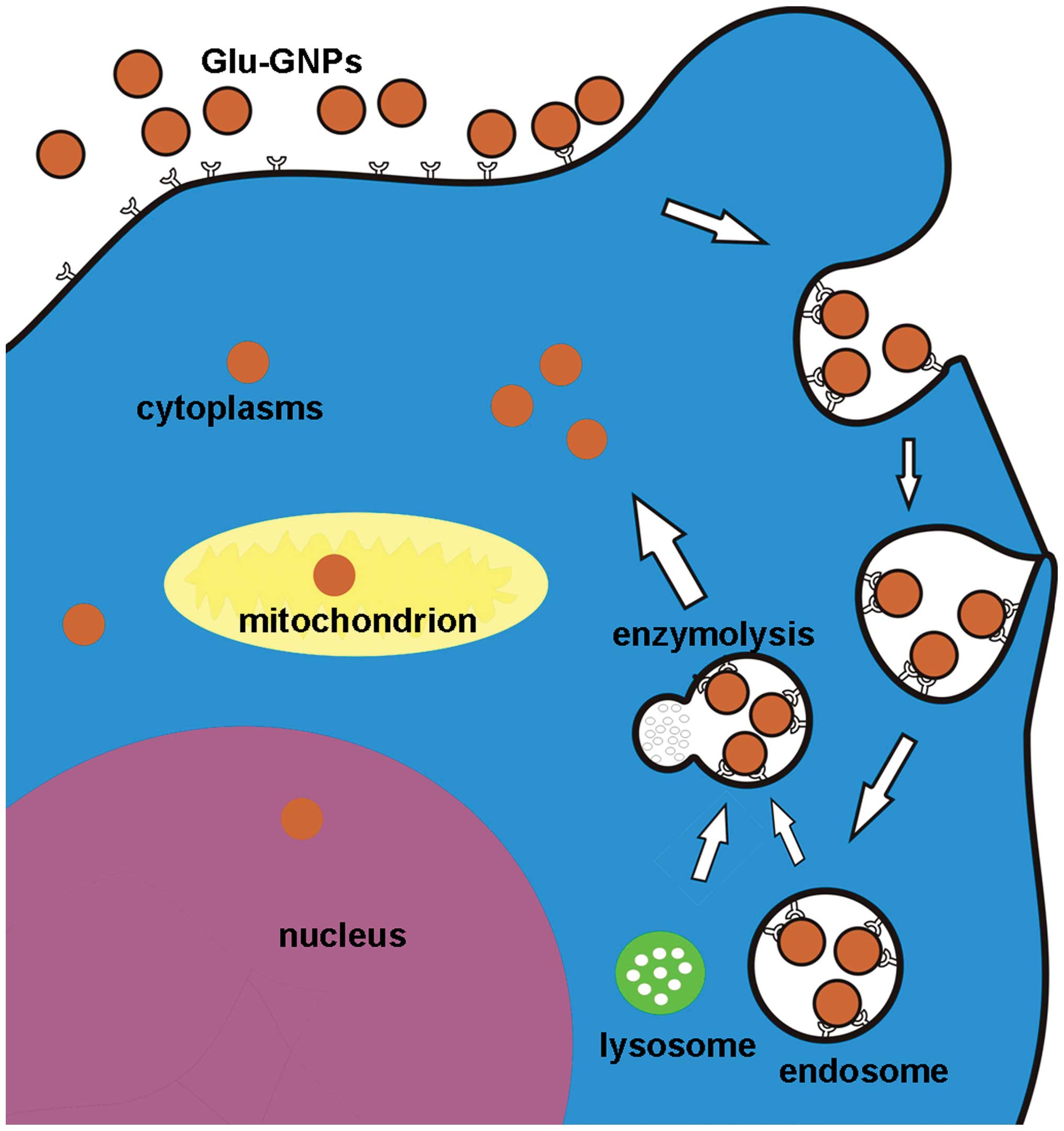 Endocytosis has thus far been suggested to be the internalization mechanism for naked GNPs. Our TEM images clearly showed that the endosome contained GNPs, which supports our cell endocytosis postulation. Chithrani et al(8,9) demonstrated the receptor-mediated endocytosis process on three different cell lines by transferring coated GNPs. However, different ligands coated on the GNPs may lead to different results. However, how glucose-coated GNPs enter the cell has never been explored. Glucose can enter the cells by two ways. Facilitated diffusion and energy-dependent active transport are both mediated by GLUTs. With facilitated diffusion, GLUTs transport glucose molecules from higher to lower concentrations. Active transport occurs with glucose being carried into the cell against a concentration gradient (34). In order to determine the internalization mechanism of Glu-GNPs, two cancer cell lines with GLUT1 overpression were employed (35,36). Both types of cells were first cultured in glucose-contained DMEM and then the medium was replaced with glucose-free medium, which means zero glucose concentration outside the cells. Subsequently, both the naked GNPs and Glu-GNPs were added into the medium. At various time-points, the uptake concentrations of the nanoparticles by the cells were measured by ICP-Mass. As mentioned above, more glucose-bounded GNPs than naked GNPs were taken by the cells. These results suggest that GLUTs play an important role in the uptake process. This process is an energy-dependent transport as the glucose concentration is lower in the medium. Six functional GLUTs have been identified (GLUT 1–5,7) thus far. Among them, GLUT-1 is most important. With the highest glucose affinity, GLUT-1 can transport glucose molecules even in a lower concentration environment (37). Based on the results from our experiments and results from other reports, we can postulate that the procedure of Glu-GNP internalization is as follows: glucose molecules on the surface of GNPs first bind with GLUTs and then the endocytosis process is initiated (the size of GNPs is too large compared with the inner diameter of GLUT and thus impossible to directly pass through). The postulated schematic procedure for Glu-GNPs internalization and their subcellular location is shown in Fig. 9.