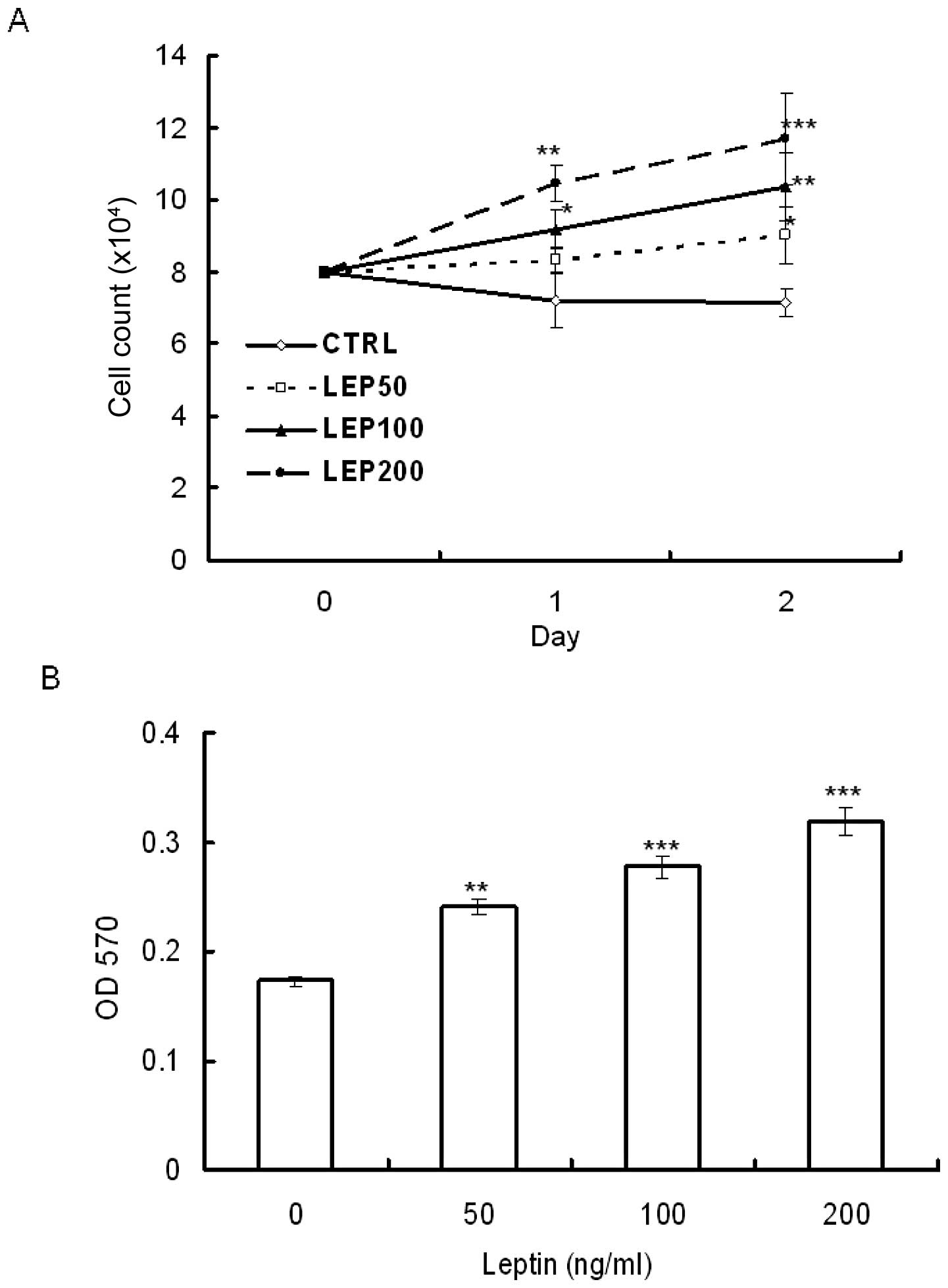 Cells were seeded in 6-well plates, treated with the vehicle, recombinant human leptin, or AG490, U0126, PD98059, Ly294002 and wortmannin for the indicated periods of time, stained with 0.5% trypan blue (Biological Industries, Ltd.) and then counted.