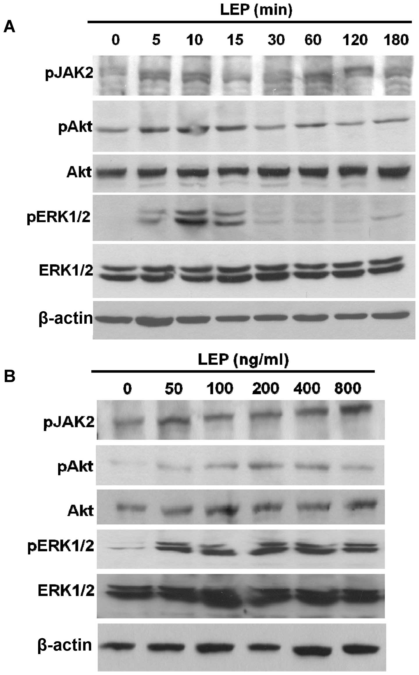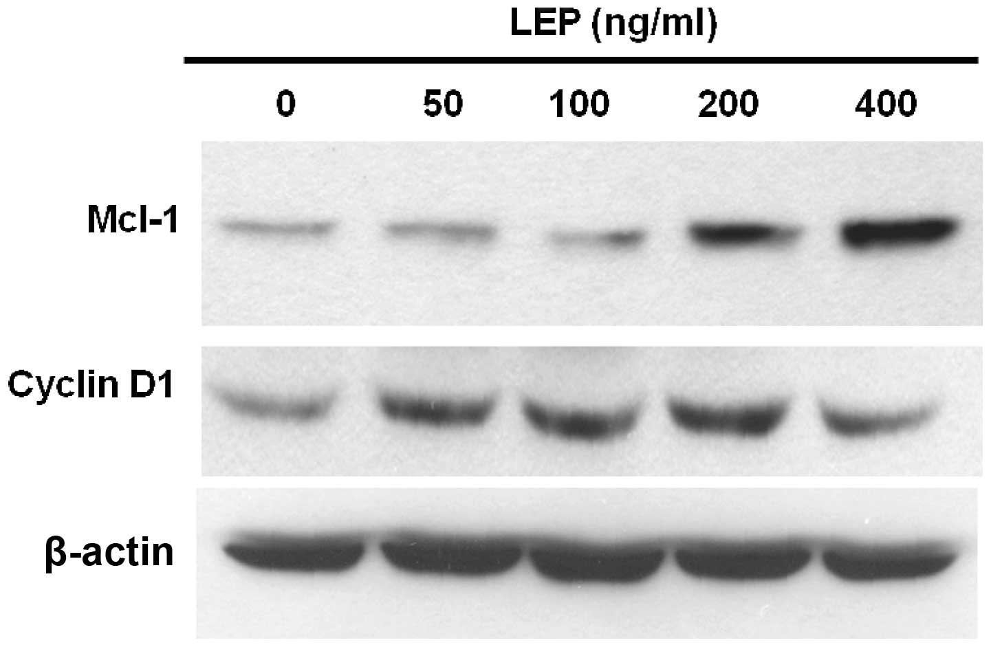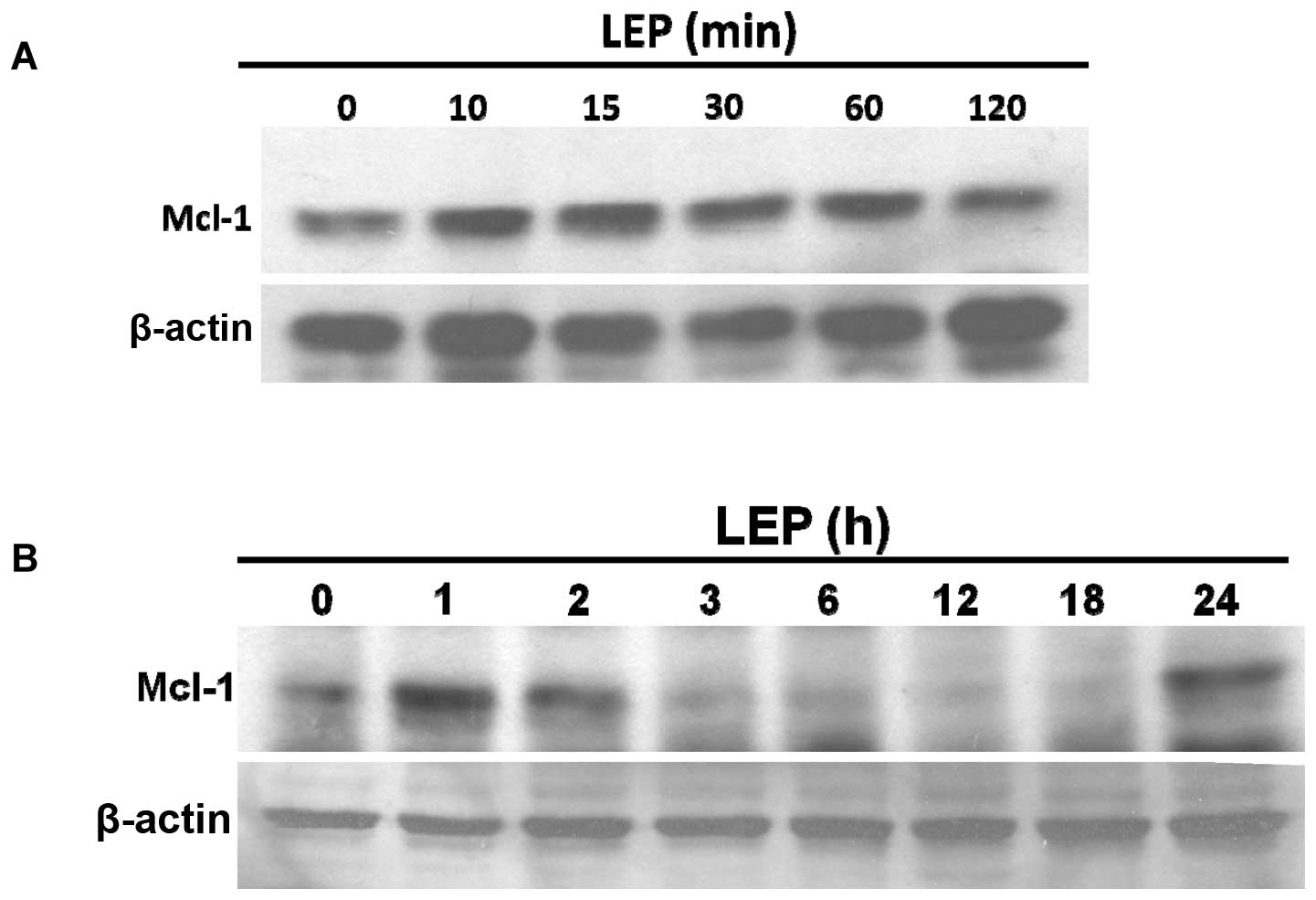 Human recombinant leptin, tyrphostin AG490, U0126, PD98059, Ly294002 and wortmannin were purchased from Sigma Chemical Co. (St. Louis, MO). Antibodies were obtained and included monoclonal anti-β-actin antibody (Sigma Chemical Co.), polyclonal antibodies against phospho-Akt or phospho-ERK1/2 (Cell Signaling Technology, Beverly, MA), monoclonal antibody against Akt or cyclin D1 (BD Pharmingen, Palo Alto, CA), and polyclonal antibodies against ani-Mcl-1 or ERK1/2 (Santa Cruz Biotechnology, Inc., Santa Cruz, CA).