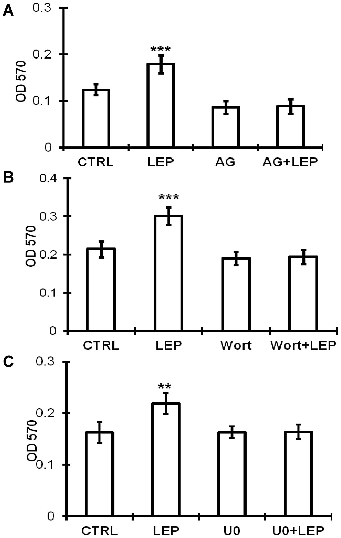 In order to determine the intracellular signaling pathways responsible for the effect observed with leptin treatment, we analyzed the phosphorylation status of JAK2, Akt and ERK1/2. The phosphorylated forms of JAK2, Akt and ERK1/2 were dose-dependently increased by leptin in the OVCAR-3 cells (Fig. 5B). Simultaneously, the time-course experiments showed that the levels of the phosphorylated forms of JAK2, Akt and ERK1/2 were increased as early as 5 min in the OVCAR-3 cells during leptin treatment (Fig. 5A). Leptin treatment resulted in the activation of JAK2, Akt and ERK1/2 kinases in the ovarian cancer cells. Subsequently, we used pharmacological inhibitors to determine the involvement of these signaling kinases on the growth-stimulating effect of leptin. The leptin-stimulated growth of the OVCAR-3 cells was abolished by the inhibitor specific for JAK2 (AG490) (Fig. 6A), PI3K/Akt (wortmannin) (Fig. 6B) and MEK/ERK1/2 (U0126) (Fig. 6C), which is consistent with the activation of the JAK2, PI3K/Akt and MEK/ERK1/2 pathways.