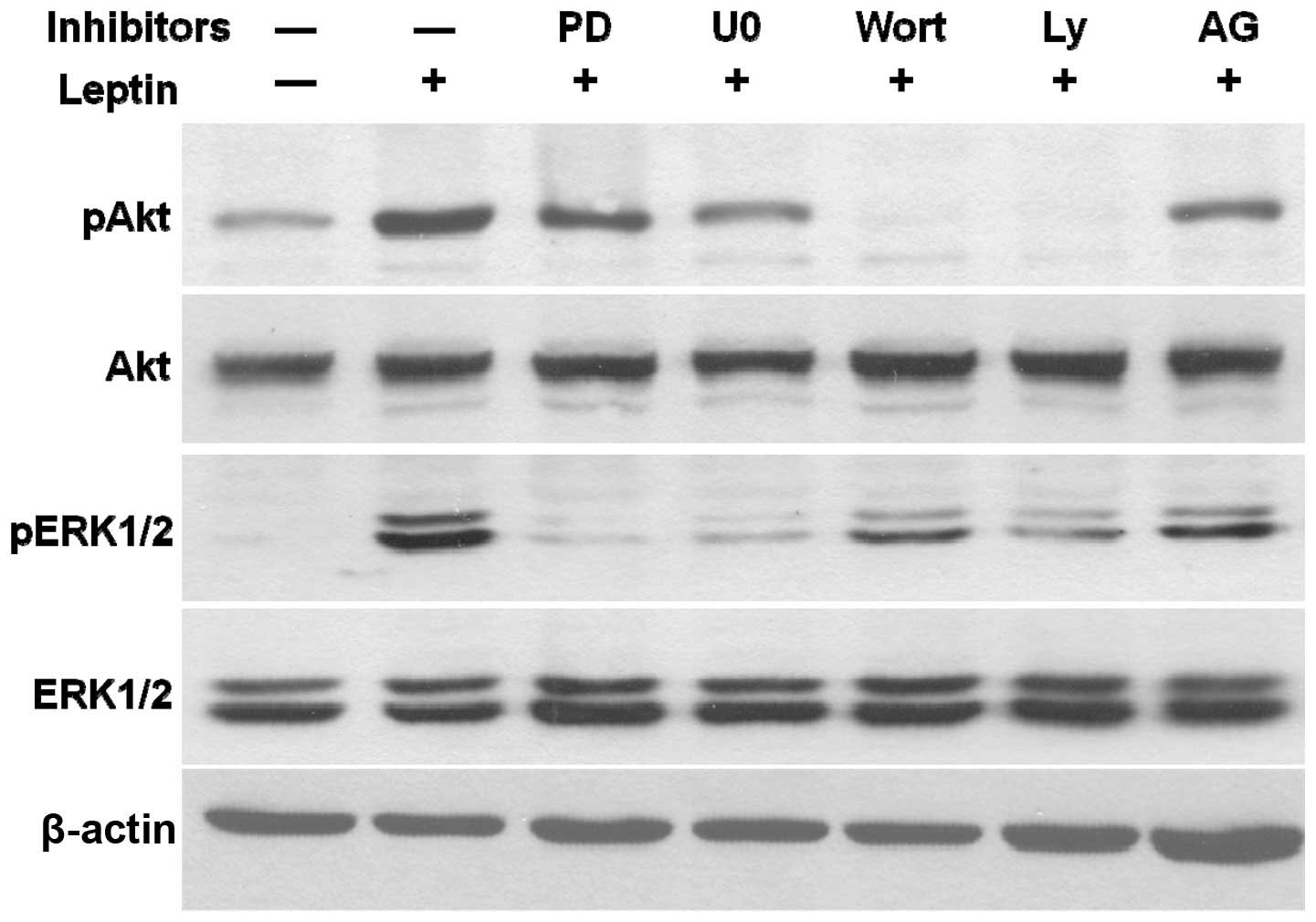 Using AG490, the inhibitor of JAK2, PD98059 and U0126, the inhibitors of MEK/ERK1/2 and the inhibitors of PI3K/Akt, wortmannin and Ly294002, we examined the leptin-stimulated phosphorylation of Akt and ERK1/2 to elucidate the crosstalk among these signaling pathways in OVCAR-3 cells (Fig. 8). As expected, U0126 and PD98059 specifically blocked the leptin-induced phosphorylation of ERK1/2, while wortmannin and Ly294002 inhibited the leptin-induced phosphorylation of Akt. The specific blocker of JAK2, AG490, decreased leptin-phosphorylated ERK1/2 and Akt. Wortmannin and Ly294002, not only inhibited leptin-activated Akt but also completely abrogated the effects of leptin on ERK1/2 phosphorylation. Similar results were observed with U0126 and PD98059 treatments. The inhibitors of the MEK/ERK1/2 pathway concomitantly blocked the leptin-activated phosphorylation of ERK1/2 and partially decreased the level of leptin-induced phosphorylated Akt. According to these findings, we propose that leptin triggers a JAK2-initiated signaling cascade, comprised of the PI3K/Akt and MEK/ERK1/2 pathways in ovarian cancer.