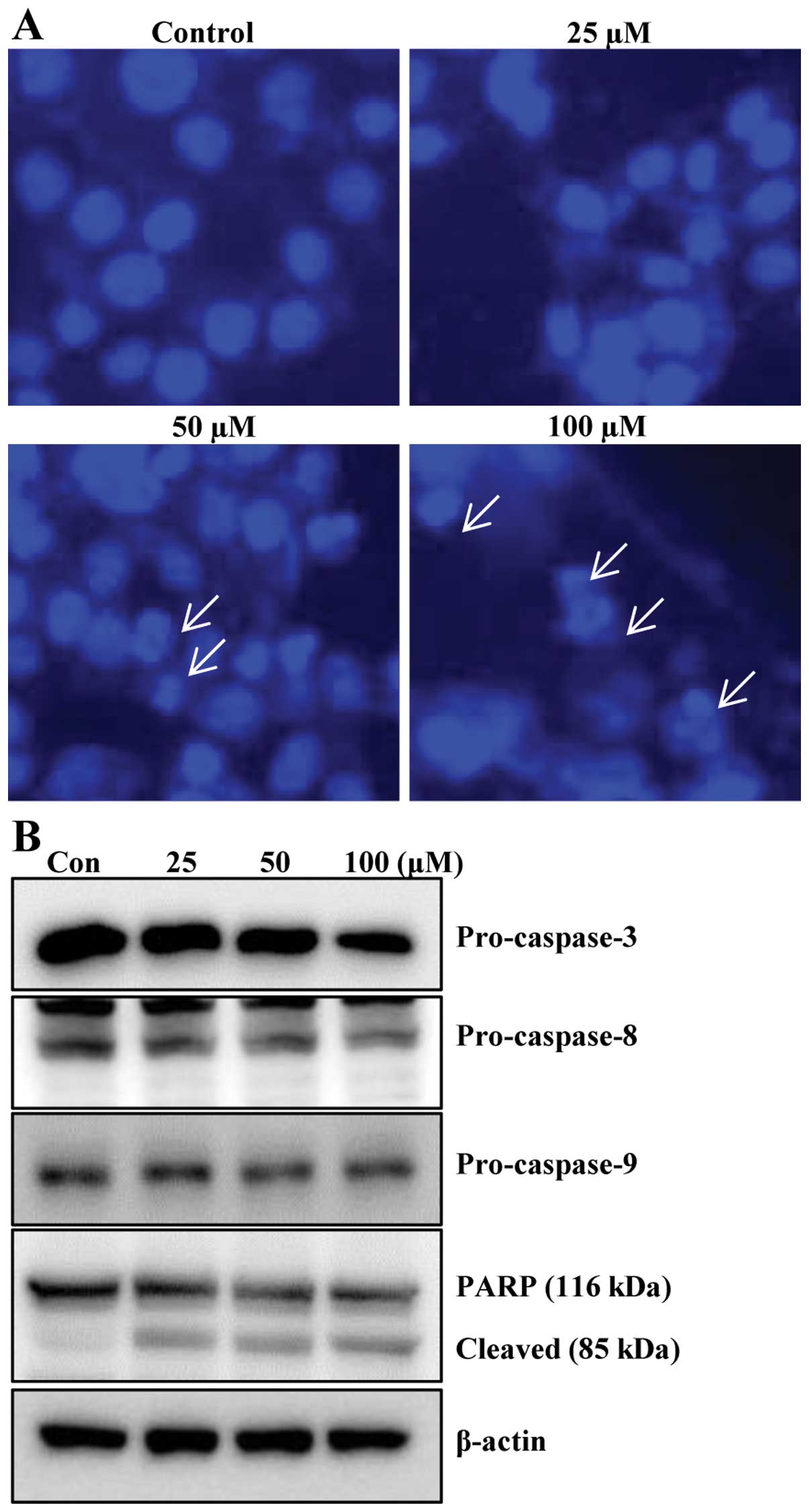 To investigate whether the growth inhibitory effects of baicalein were due to the induction of apoptosis in HCT116 cells, morphological changes of cellular structures were assessed with Hoechst 33342 staining. As shown in Fig. 3A, nuclei with chromatin condensation and formation of apoptotic bodies, which are characteristics of apoptosis, were seen in cells cultured with baicalein in a concentration-dependent manner, whereas the control cells maintained their nuclear structure intact. During apoptotic process, caspases play major roles in both the intrinsic and extrinsic pathways. Thus, the levels of caspase-3, -8 and -9 were investigated in order to determine whether caspases are associated with baicalein-induced apoptosis in HCT116 cells. Treatment with baicalein showed decreased pro-caspase-3 and -8 levels and induced cleavage of PARP (Fig. 3B). These results indicated that growth inhibitory effects of baicalein were due to the induction of apoptosis in HCT116 cells.