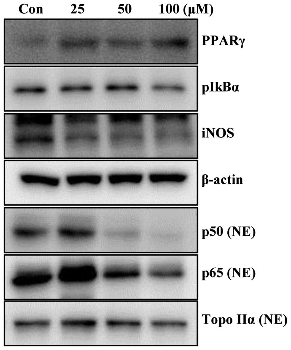 PPARγ agonists can inhibit the activities of signal dependent transcription factors, such as NF-κB. This function could contribute to the anti-inflammatory actions of PPARγ. To verify whether baicalein modulates the NF-κB activity through the PPARγ activation, western blot analysis was performed and expression levels measured of NF-κB-related protein. Treatment of baicalein induced PPARγ activation and inhibited pIκBα, p50, p65 and iNOS levels (Fig. 4). These results suggested that NF-κB activity was suppressed through PPARγ activation by baicalein treatment in HCT116 cells.
