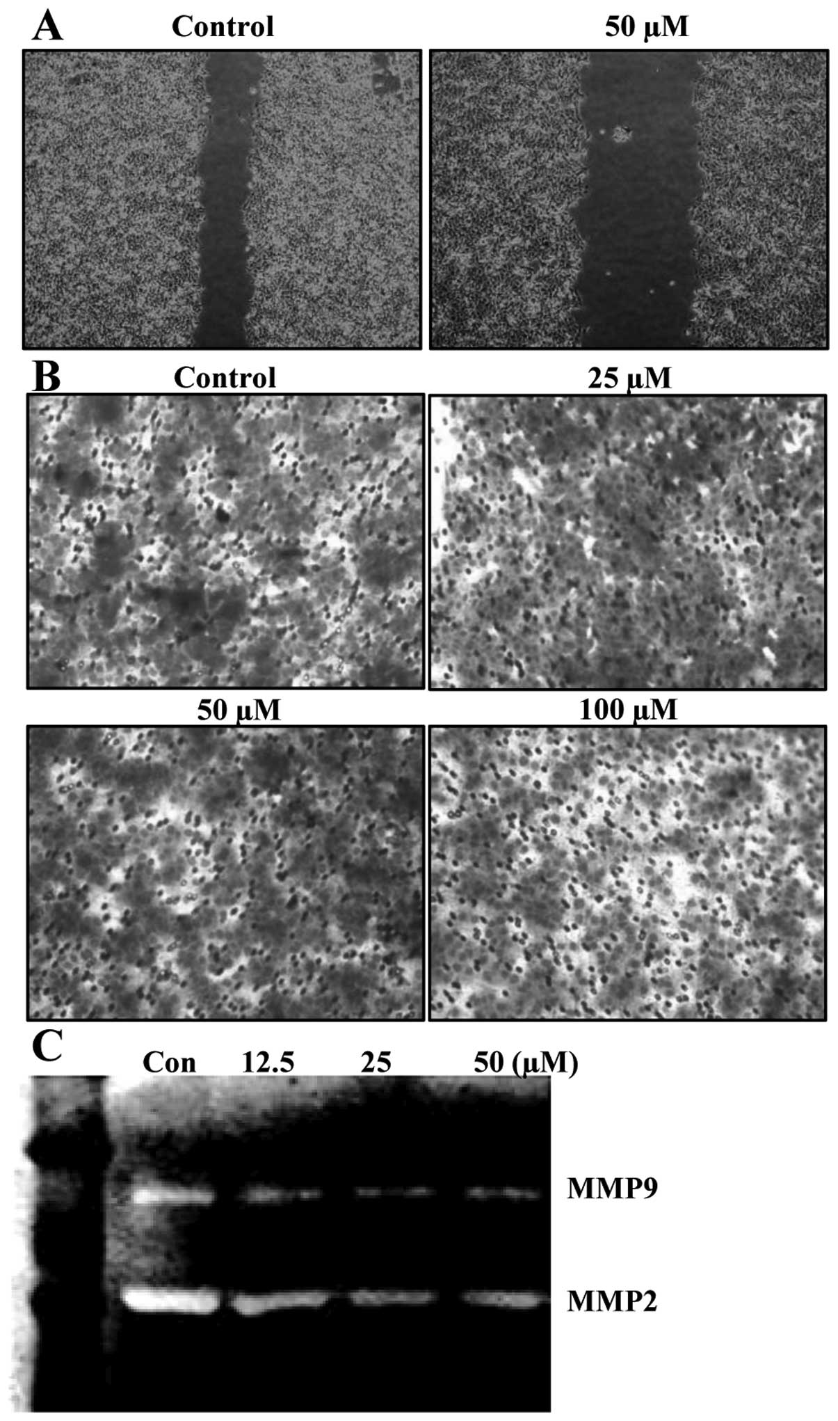 To determine whether or not biacalein inhibits migration of HCT116 cells, wound-healing experiments were performed. Results demonstrated that 50 μM of baicalein for 24 h, which was not cytotoxic, as shown by the MTT assay, delayed the migration of HCT116 cells compared to that of control cells (Fig. 5A). Using a Boyden chamber migration assay, we next examined the question of which baicalein decreases the activity of cell migration. As shown in Fig. 5B, treatment of cells with 50 μM of baicalein markedly reduced cell invasion through the Matrigel chamber. Because cell migration plays an important role in the metastasis process, and migration of the basement membrane is primarily mediated by gelatinase matrix metalloproteinases (MMPs), we tested the effects of baicalein on MMP gelatin zymography. Treatment of baicalein reduced the expression of the MMP-2 and -9 activities (Fig. 5C). These results suggested that the anti-migration effect of baicalein is associated with inhibition of MMP-2 and -9 activities in HCT116 cells.