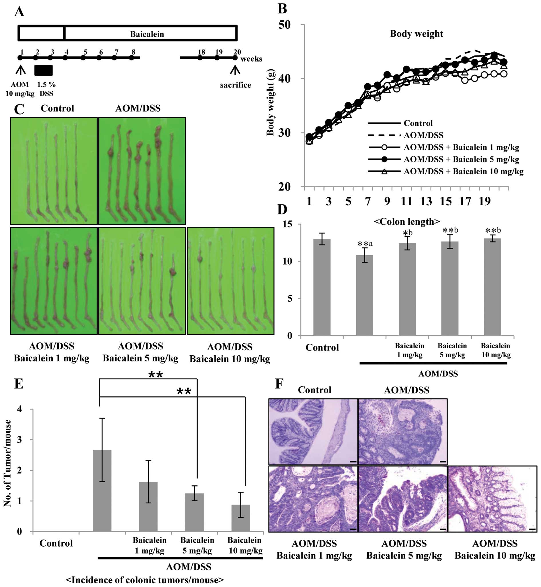 The animal protocol used in this study was reviewed by the Pusan National University-Institutional Animal Care and Use Committee (PNU-IACUC, Busan, Korea) on the ethics of animal procedures and scientific care, were approved. Five-week-old male ICR mice were purchased from Samtako Co., Ltd. (Osan, Korea). All animals were housed in plastic cages (4 mice/cage) and had free access to drinking water and a basal diet (Formula M07; Feed lab) under controlled conditions of humidity (50±10%), light (12/12 h light/dark cycle), and temperature (∼23°C). After arrival, the animals were quarantined for the first 7 days, and then randomized by body weights into experimental and control groups. A colonic carcinogen AOM was purchased from Sigma-Aldrich. DSS with a molecular weight of 36,000–50,000 (cat. no. 160110) was purchased from MP Biomedicals, LLC (Aurora, OH). For the induction of colitis, DSS was dissolved in water at a concentration of 1.5% (w/v). Experimental groups included group 1 (control group, n=6); group 2 (n=8) was treated with AOM and DSS; groups 3–5 (n=8 for each group) were treated with AOM, DSS and baicalein (1 mg/kg for group 3, 5 mg/kg for group 4, 10 mg/kg for group 5). Mice in groups 2–5 were given a single intraperitoneal injection of AOM (10 mg/kg body weight). Starting 1 week after the injection, animals received 1.5% DSS in the drinking water for 7 days. Subsequently, groups 3–5 received the diets containing 1, 5 and 10 mg/kg baicalein for 16 weeks, respectively. All animals were sacrificed at week 16 after administration of baicalein. At sacrifice, complete necropsies were done on all mice. Histopathological examination was performed on paraffin-embedded sections after hematoxylin and eosin (H&E) staining.
