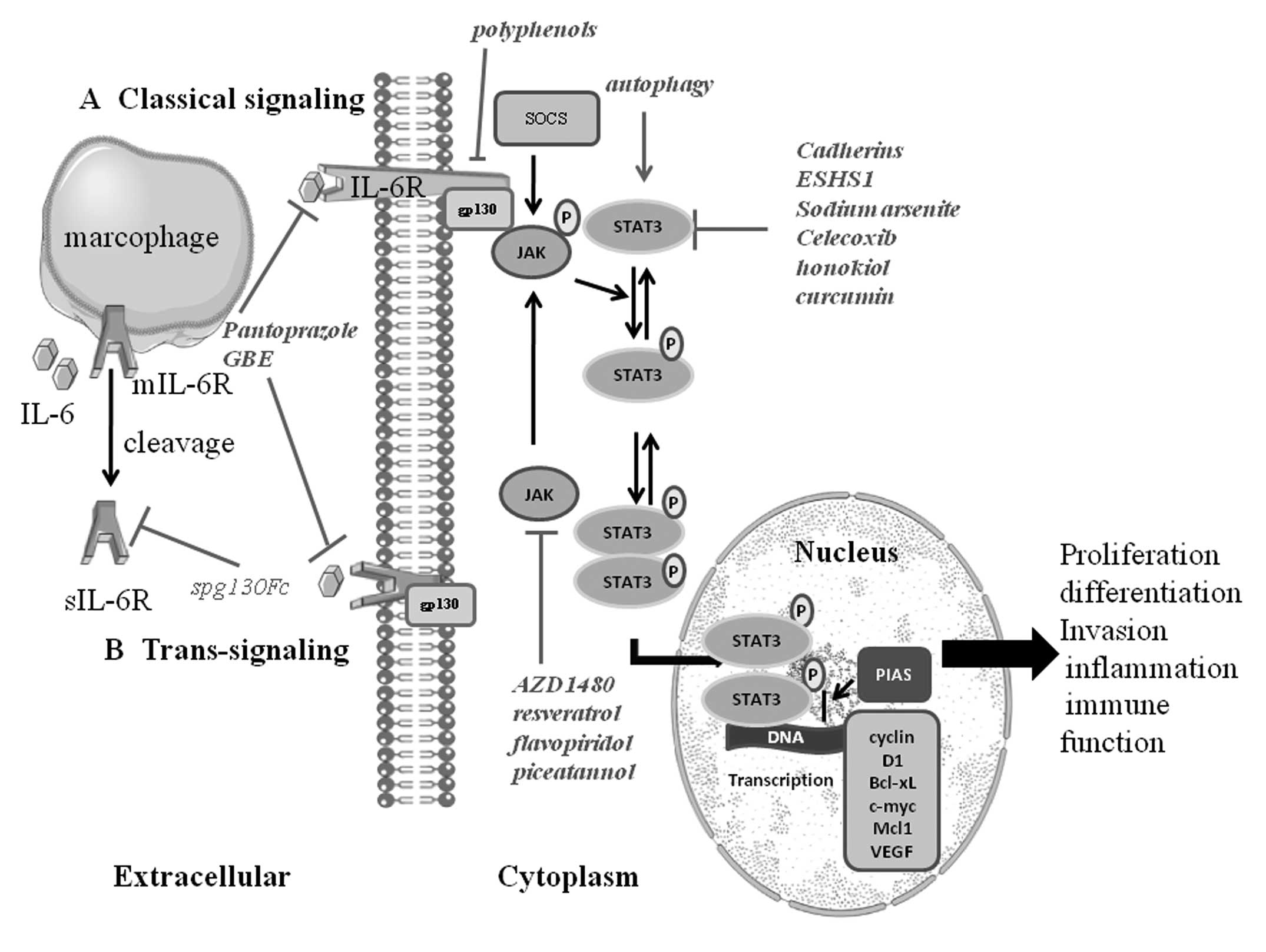 The signal transduction of IL-6 involves the activation of JAK, then leads to the activation of transcription factor STAT3 (15). Over 40 different cytokines or growth factors can activate STAT signaling pathway. Normally STAT3 resides in the cytoplasm. STAT3 will be phosphorylated and then forms dimers with other members of the STAT family when activated by upstream signaling pathways such as JAK, epidermal growth factor receptor and IL-6R activation. The activated STAT3 complex will then translocate from the cytoplasm to the nucleus initiating transcription of STAT3 target genes including cyclin D1, Bcl-xL, c-myc, Mcl1 and vascular endothelial growth factor (VEGF) by combining with consensus DNA elements (16). STAT3 is known to play an important role in promoting tumorigenesis of diverse human cancers (17), since it is regarded as an oncogenic transcriptional factor involving in cancer cell proliferation, differentiation, invasion, inflammation and immune function (Fig. 1).