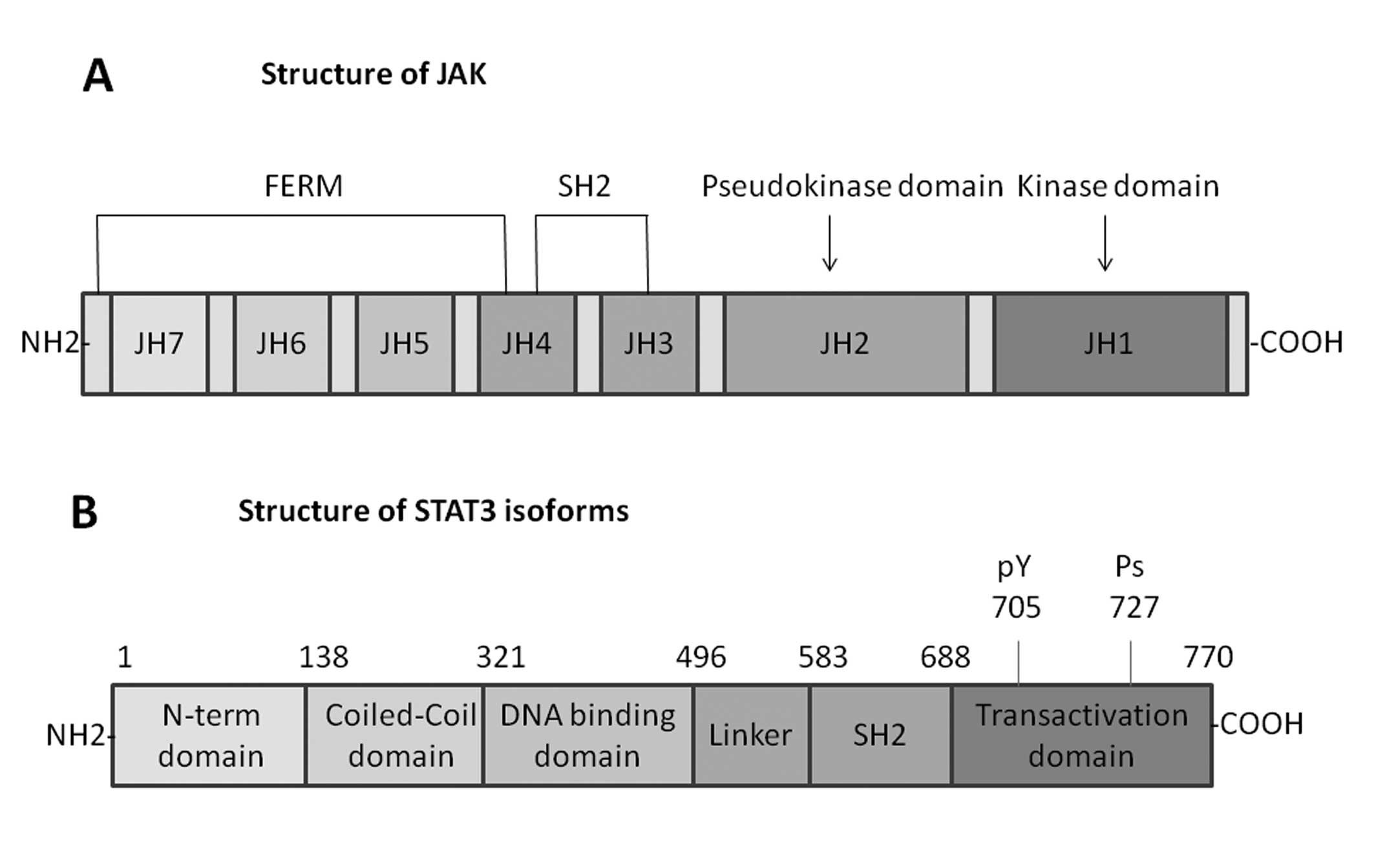 The JAK family proteins of cytoplasmic tyrosine kinases include four mammalian members, which are related to the cytoplasmic regions of signal transducing cytokine receptors. Three of them, JAK1, JAK2 and TYK2, are expressed in various tissues, yet JAK3 is expressed only in cells of the hematopoietic system (18). The unique structure of the JAKs easily differentiates them from other members of the protein tyrosine kinase family. The most attractive feature of these proteins is the presence of two JAK homology (JH) domains, JH1 and JH2, which have extensive homology to tyrosine kinase domains. JH1 domain at the C-terminus appears to be a functional tyrosine kinase domain, while the JH2 domain does not possess substantial tyrosine kinase activity (19). The JH3-JH7 regions, which form the N-terminal half of the JAKs, are related to binding to cytokine receptors. A portion of the N-terminal region of JAKs has similar sequence with the so-called four-point-one, ezrin, radixin and moesin (FERM) domains, and JAKs have been proved to shield a divergent type of FERM domain. The SH2 domain also contains JH3 and JH4 domains. The selectivity of STAT activation by various ligands mainly depends on the highly specific interactions between the SH2 domain and the phosphotyrosine residues on each receptor (20) (Fig. 2).