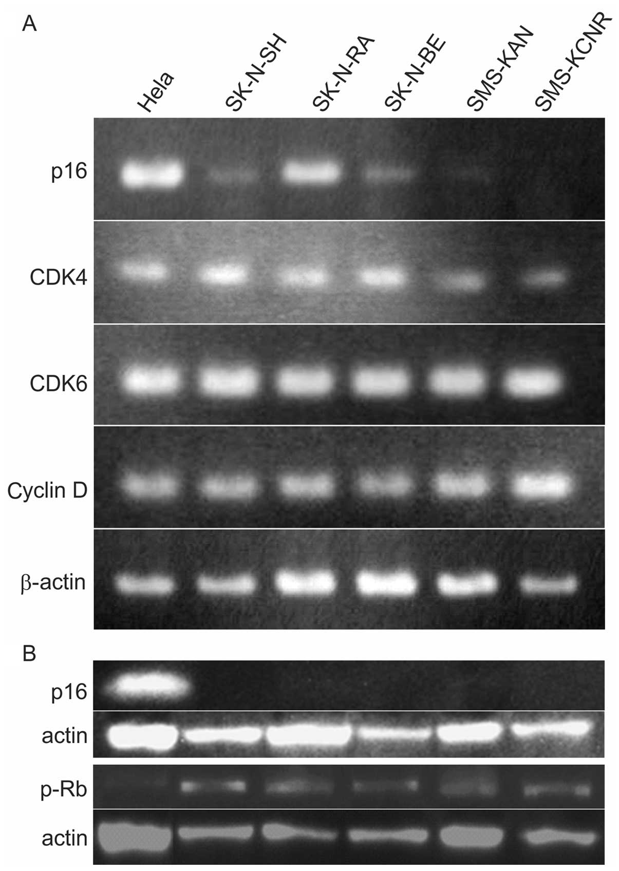 Total RNA was extracted from each human neuroblastoma cell line by using the RNeasy Mini kit (Qiagen Sciences, MD, USA). cDNA was synthesized using random primers and a cDNA synthesis kit (High Capacity cDNA RT kit, Applied Biosystems, Foster City, CA, USA). PCR was performed with AmpliTaq Gold (Applied Biosystems). Amplification conditions and primer sequences for p16, CDK4, CDK6 and cyclin D are listed in Table I.