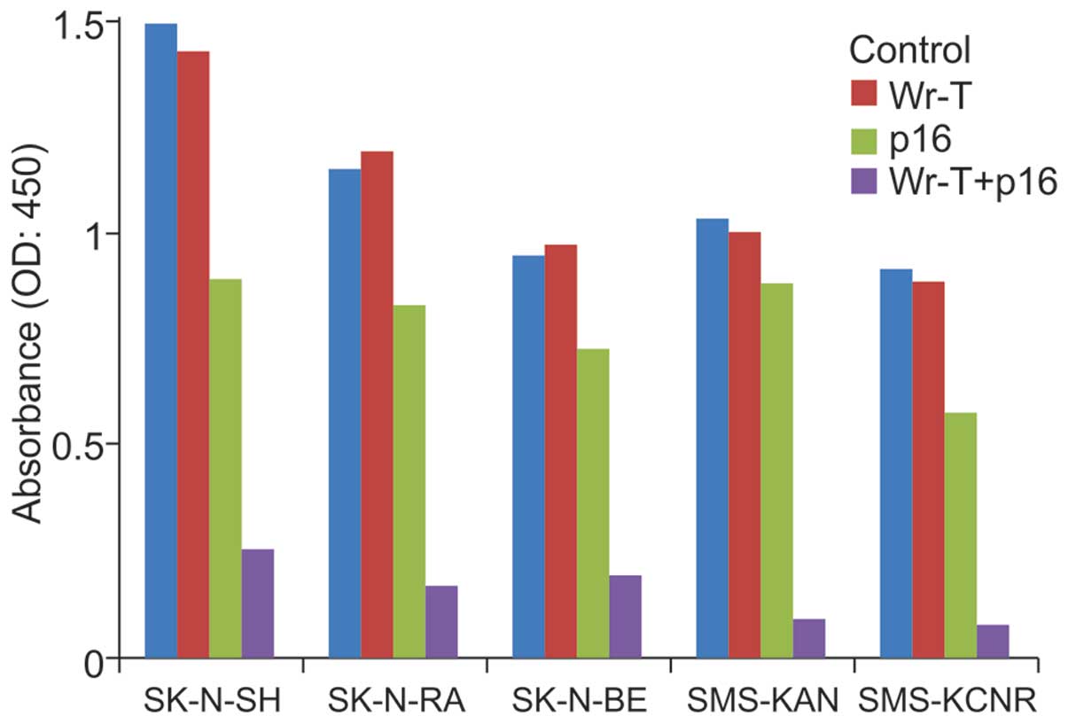 We used Wr-T to introduce p16INK4a and determined its antitumor efficacy in NB. This method yielded strong tumor suppression in NB with few side-effects, and is thus a promising candidate for clinical application in cancer therapy.