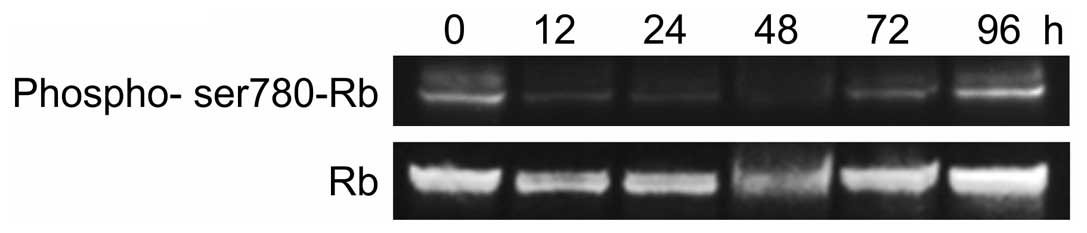 We also observed the effect of r9-p16 MIS peptide on endogenous RB phosphorylation in SMS-KAN cells by western blotting (Fig. 3). A clear quantitative reduction in pRB was observed at 12 h (Fig. 3). The r9-p16 MIS peptide, which was transported efficiently into nuclei due to Wr-T, likely suppressed RB phosphorylation and arrested the cell cycle at G1 by replacing the absent p16INK4a in the RB pathway. Quantitative reduction reached its peak at 48 h after introduction, while tumor re-enlargement was observed by 96 h. While the Wr-T/r9-p16 MIS peptide mix suppressed cell proliferation through G1 arrest, the complex degrades over time, allowing RB phosphorylation to progress again.