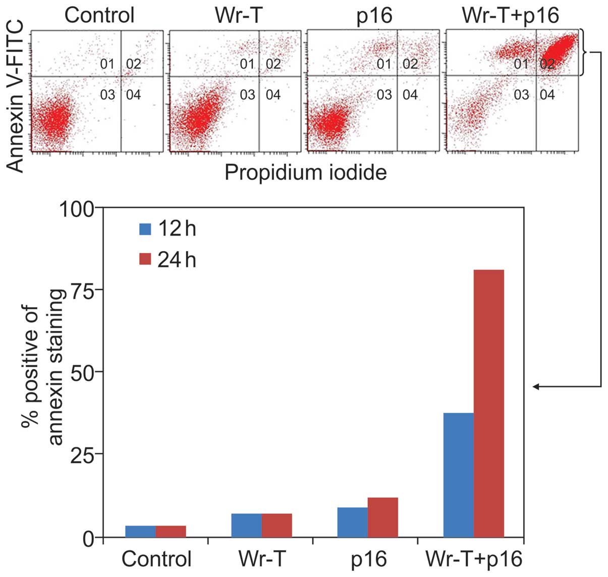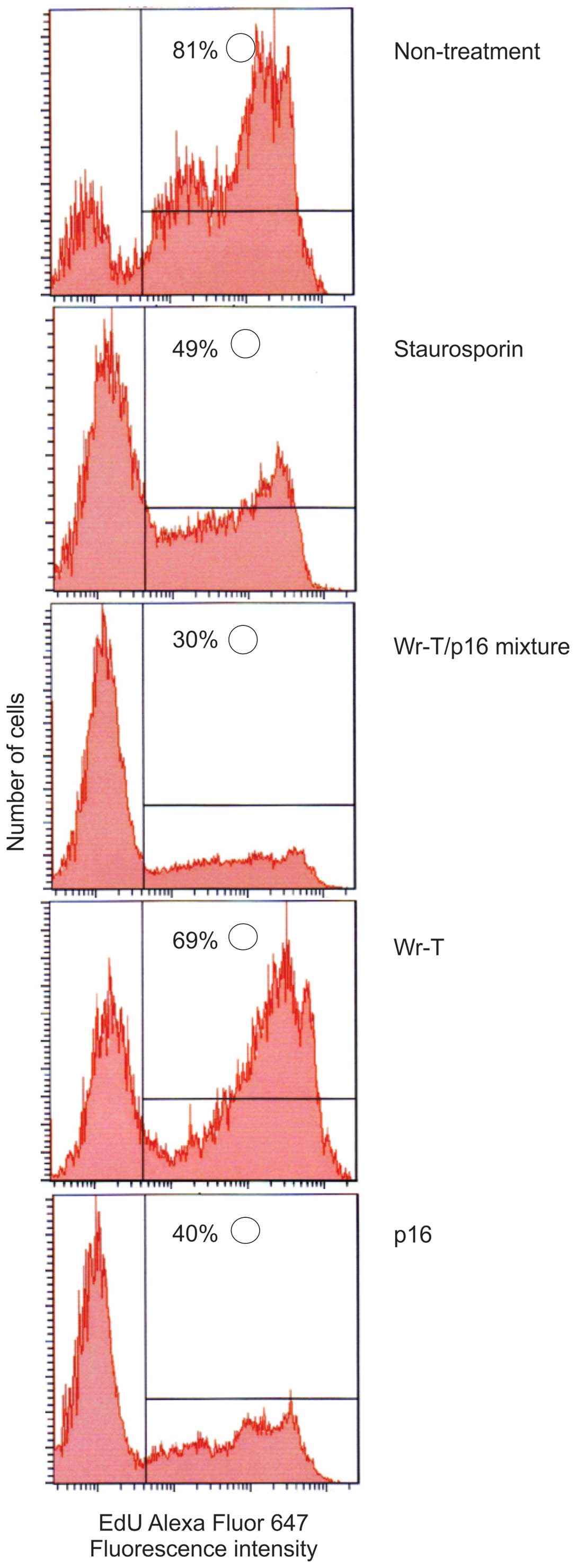 In order to examine the effects of the r9-p16 MIS peptide on the cell cycle, DNA uptake of EdU was used as a marker and Staurosporin was used as a positive control. Tumor growth suppression was verified in the SMS-KAN cell line, which lacks p16INK4a (Fig. 4). While EdU uptake occurred in 81% of untreated cells, uptake volume in cells treated with p16 alone and Wr-T/p16 complex was markedly suppressed (40 and 30%, respectively), indicating that cell division was suppressed. Tumor growth inhibition was also verified with Annexin V-FITC and propidium iodide (PI) staining using the SMS-KAN cell line, which lacks p16INK4a expression (Fig. 5). The mechanism of cell death due was thought to be apoptosis. Twelve hours after treatment, the percentage of cells with Annexin V-positive/PI-negative staining was 2.1% in the control group, 3.6% in the Wr-T group, 5.8% in the r9-p16 MIS peptide group, and 17.9% in the Wr-T/r9-p16 MIS peptide mix group. At 24 h, the percentage of dead cells was 3.4% in the control group, 6.8% in the Wr-T group, 12% in the r9-p16 MIS peptide group, and 81.3% in the Wr-T/r9-p16 MIS peptide mix group. A mild increase was observed in the r9-p16 MIS peptide group, while the Wr-T/r9-p16 MIS peptide mix group displayed a markedly high value. These results indicate increased transduction efficiency of r9-p16 MIS peptide due to Wr-T.