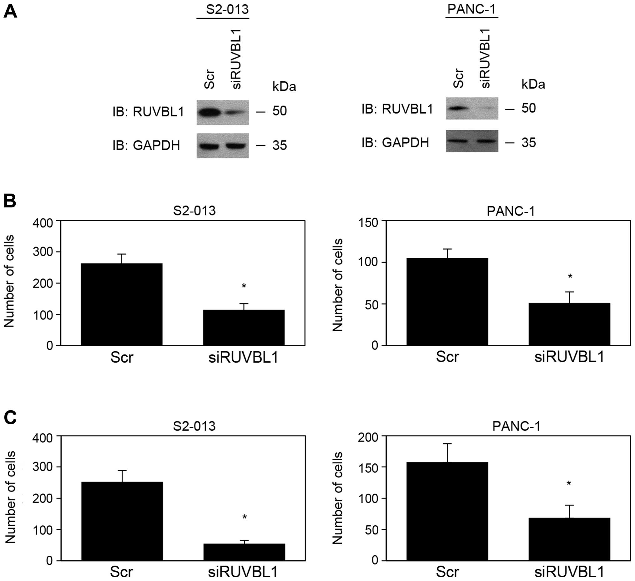 To investigate whether RUVBL1 regulates cell growth, motility and invasion, RUVBL1 expression was suppressed by a single mixture with four different siRNA oligonucleotides against RUVBL1 in moderately differentiated PDAC cells (line S2-013) and the poorly differentiated PDAC cell line PANC-1 that endogenously expressed high levels of RUVBL1. Based on western blot data, RUVBL1 expression was markedly lower in RUVBL1-RNAi cells than in control cells 72 h after transfection of the respective siRNAs (Fig. 1A). RUVBL2 expression was not changed in RUVBL1-RNAi cells, compared to control cells (data not shown). These results indicated that RUVBL1-siRNAs specifically suppressed endogenous expression of RUVBL1 in S2-013 and PANC-1 cells. RNAi-mediated suppression of RUVBL1 did not affect cell growth in an in vitro MTT assay of S2-013 and PANC-1 (data not shown). Transwell motility and Matrigel invasion assays were used to examine the effect of RUVBL1 on cell motility and invasiveness. In Transwell motility assays, motility of S2-013 and PANC-1 cells was significantly lower in RUVBL1-RNAi cells than in control cells (Fig. 1B). In two-chamber invasion assays, invasiveness of RUVBL1-RNAi cells of S2-013 and PANC-1 was significantly lower than that of control cells (Fig. 1C). These results indicated that RUVBL1 promoted the motility and invasiveness of PDAC cells.