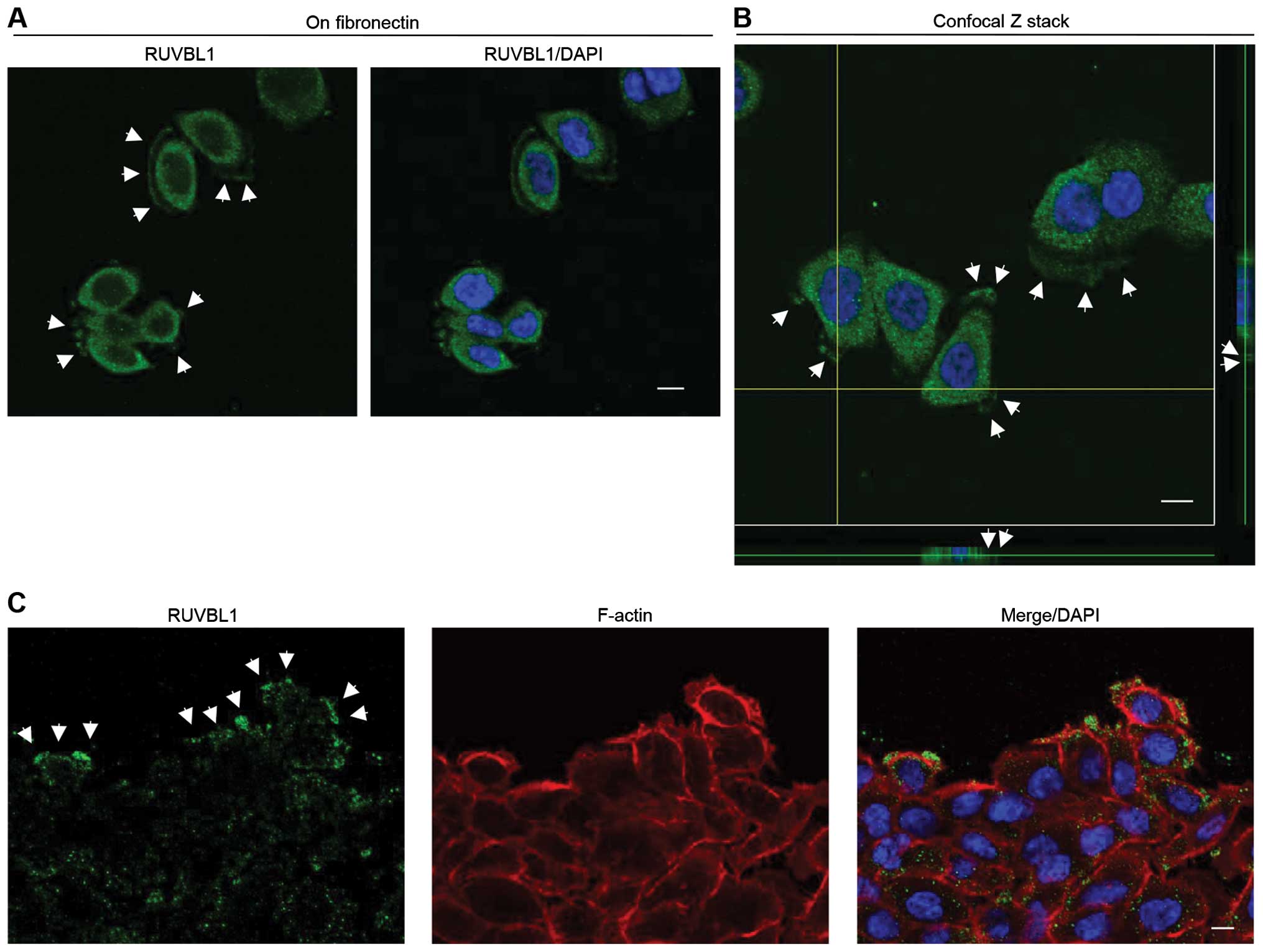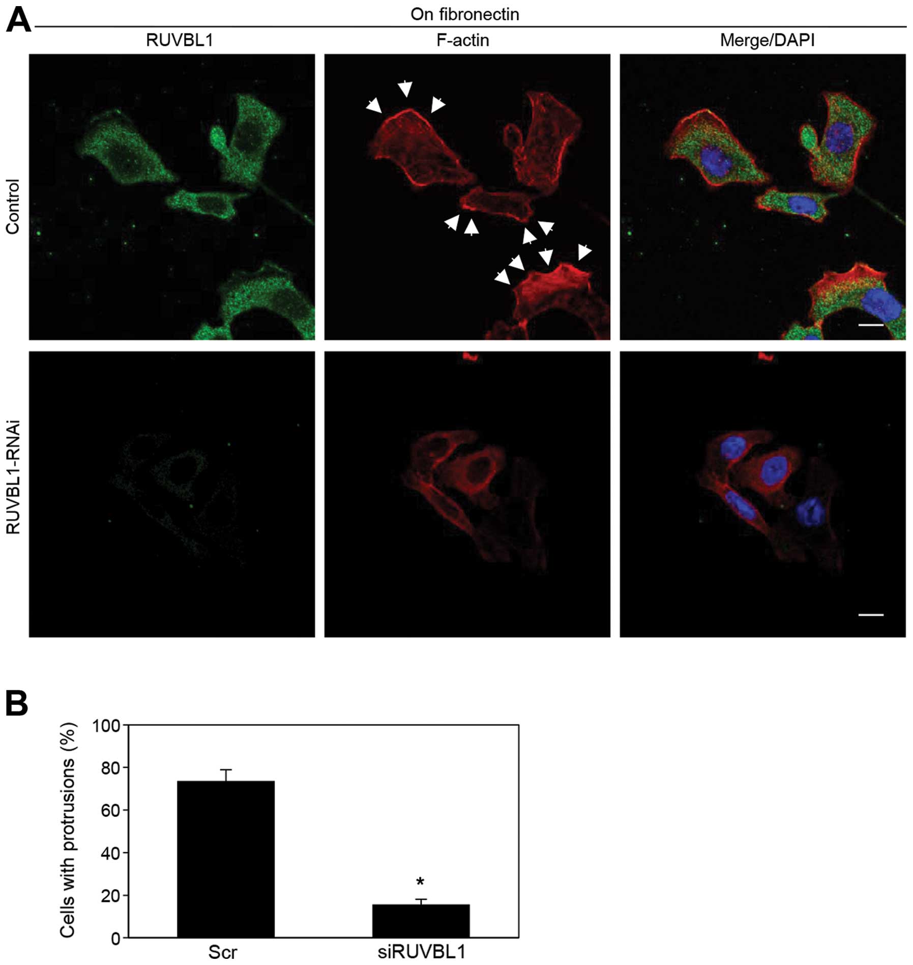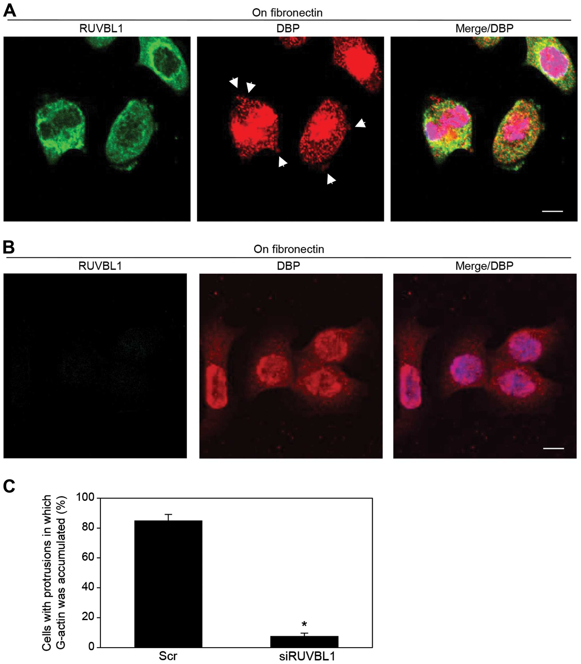 Immunocytochemical signal from RUVBL1 and fluorescent signal from peripheral F-actin structures (labeled by phalloidin) were colocalized in cell protrusions of fibronectin-stimulated S2-013 cells (arrowheads in Fig. 3D). Thus, we hypothesized that the RUVBL1-actin complexes localized in cell protrusions could function in promotion of the motility and invasiveness.