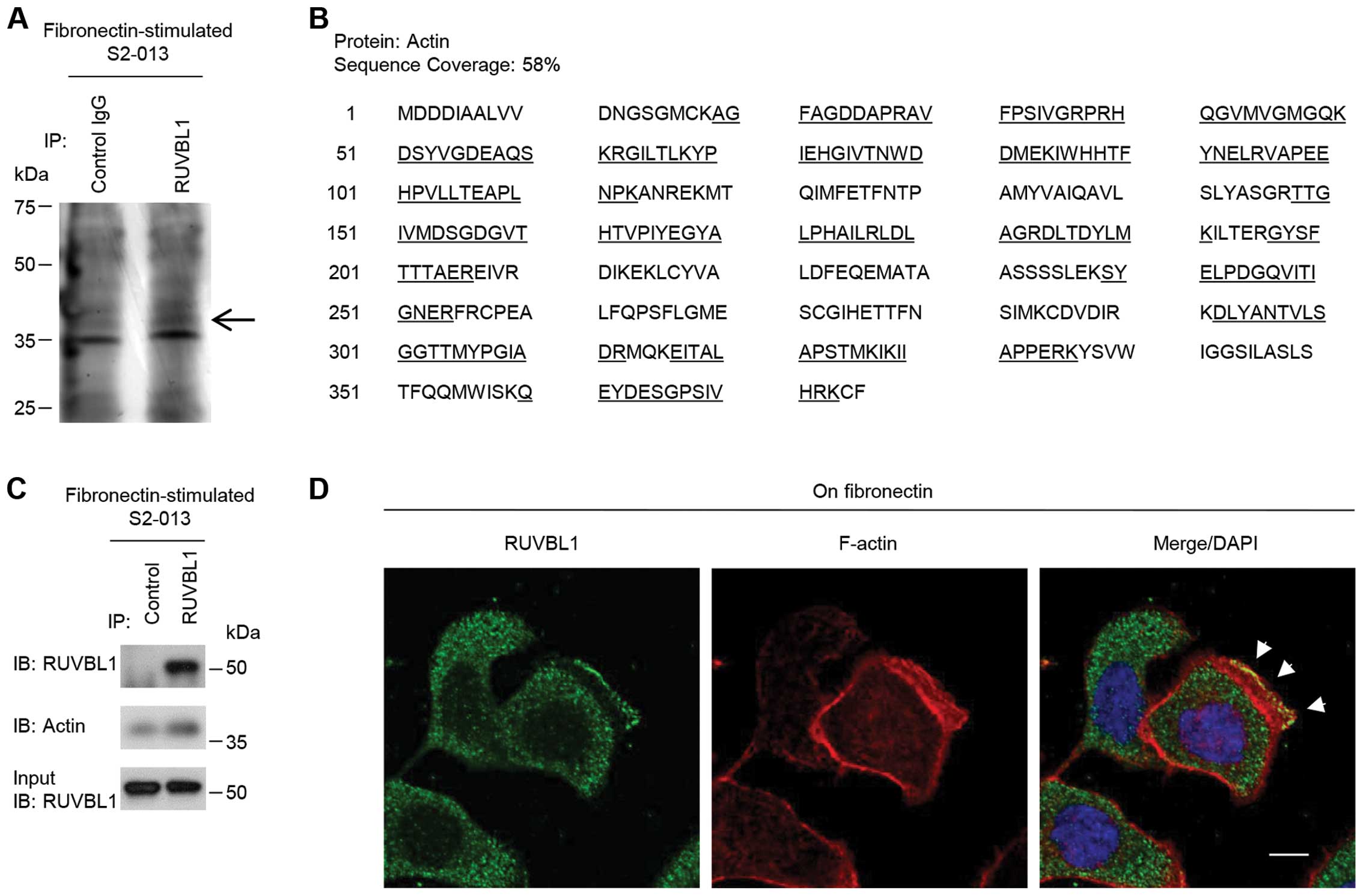 To investigate the mechanism by which RUVBL1 promoted cell motility and invasiveness, immunoprecipitation (IP) experiments were performed with lysates from fibronectin-stimulated S2-013 cells; a specific anti-RUVBL1 antibody was used to detect multiprotein complexes that contained RUVBL1. Control and anti-RUVBL1 immunoprecipitates were subject to SDS-PAGE; the separated proteins were silver stained. A 40-kDa band was evident in the anti-RUVBL1 sample that was very weak in the isotype control sample (Fig. 3A). The band was excised, and LC-MS/MS was used to identify the constituent protein after in-gel trypsin digestion; the protein was actin. The peptide sequence coverage was 58% (Fig. 3B). Immunoblot analysis showed that a faint band of actin was detected in control-immunoprecipitates from fibronectin-stimulated S2-013 cells (Fig. 3C), suggesting the presence of low levels of non-specific actin in all IP samples. Strong actin band was detected in the anti-RUVBL1-immunoprecipitates (Fig. 3C), indicating that actin was enriched in RUVBL1-IP materials compared to control IgG-IPs.