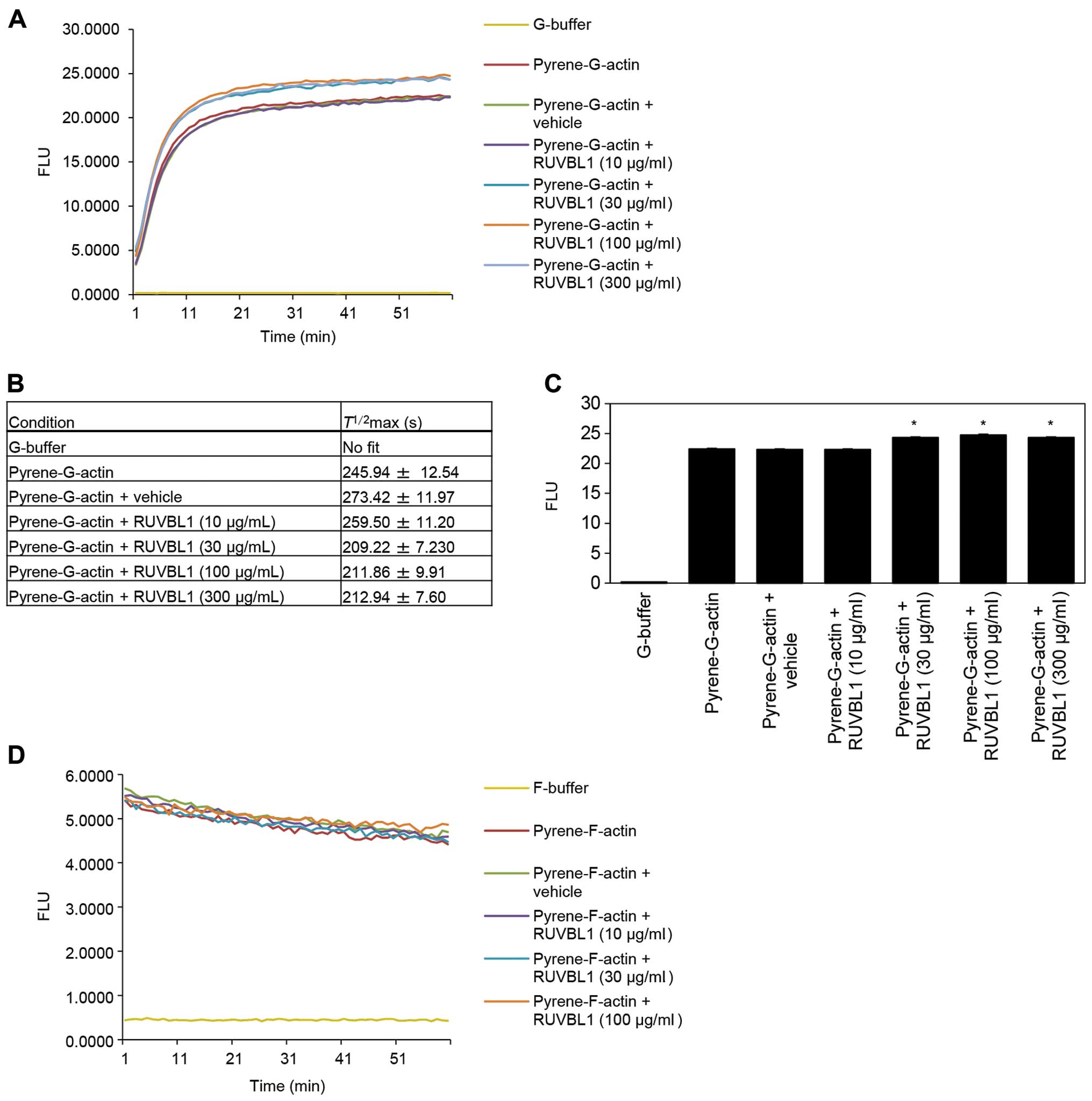 Actin exists in equilibrium between monomeric subunits and polymeric filaments. To accurately quantify these actin forms, a commercially available actin polymerization assay (BK003; Cytoskeleton) was used to measure actin polymerization under defined conditions; specifically, polymerization-dependent increases in fluorescence of pyrene-conjugated actin were measured. Each of four concentrations (10, 30, 100 or 300 μg/ml) of recombinant human RUVBL1 protein (TP301170; Origene, Rockville, MD) were added to a separate actin polymerization assay. Briefly, the actin polymerization assays were based on the enhanced fluorescence of pyrene-conjugated actin that occurs during polymerization. The enhanced fluorescence was measured by pyrene monomer G-actin formed polymer pyrene F-actin in a fluorometer at excitation wavelength 365 nm and emission wavelength 407 nm. To quantify changes in polymerization rate, Boltzmann sigmoidal equations (GraphPad Prism version 6.0 software; GraphPad Software, Inc., La Jolla, CA) were used to fit curves to the fluorescence data. Half-maximal saturated polymerization values [T1/2max (s)] were calculated from raw data.