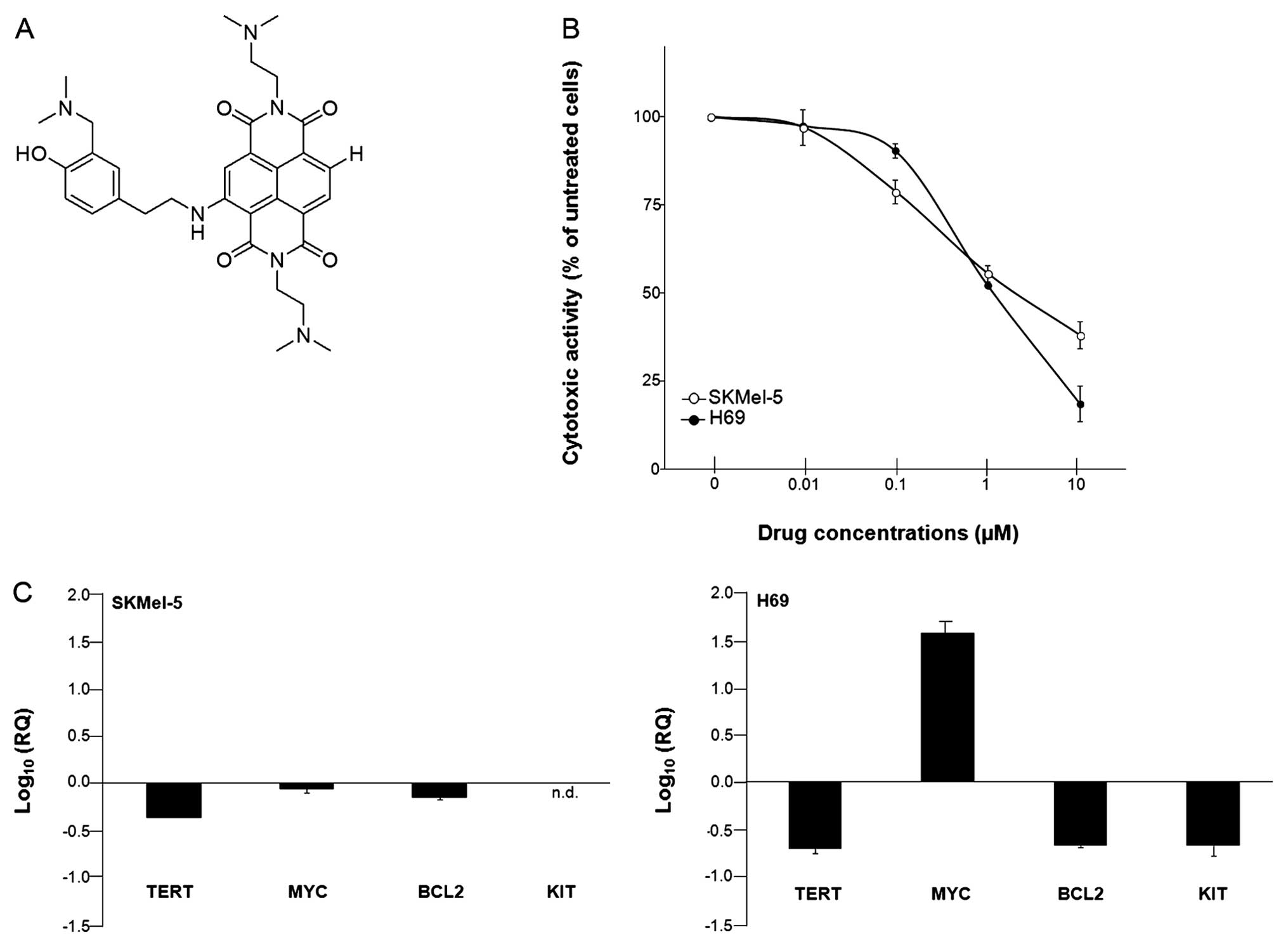 In this context, dose-response curves were instrumental to guide the choice of H-NDI-NMe2 concentration to be used for the analysis of gene expression levels. A 48-h exposure of cells to sub-toxic concentrations of the ligand (corresponding to ~1/3 of the relative IC50 values) resulted in a cell type-dependent modulation in the expression levels of selected genes (Fig. 1C). Real-time RT-PCR data showed a marked reduction of TERT expression levels (Fig. 1C), which was more pronounced in H69 (RQ, 0.20±0.02) compared to SKMel-5 cells (RQ, 0.44±0.002). A downregulation of BCL2 expression levels (Fig. 1C) was observed in both cell lines. Again, such a decrease was markedly pronounced in H69 with respect to melanoma cells (RQ, 0.21±0.01 and 0.73±0.05, respectively). In addition, small cell lung cancer cells were also characterized by a pronounced decrease in the expression levels of KIT (RQ, 0.22±0.06), which in turn was not detectable in melanoma cells (Fig. 1C).