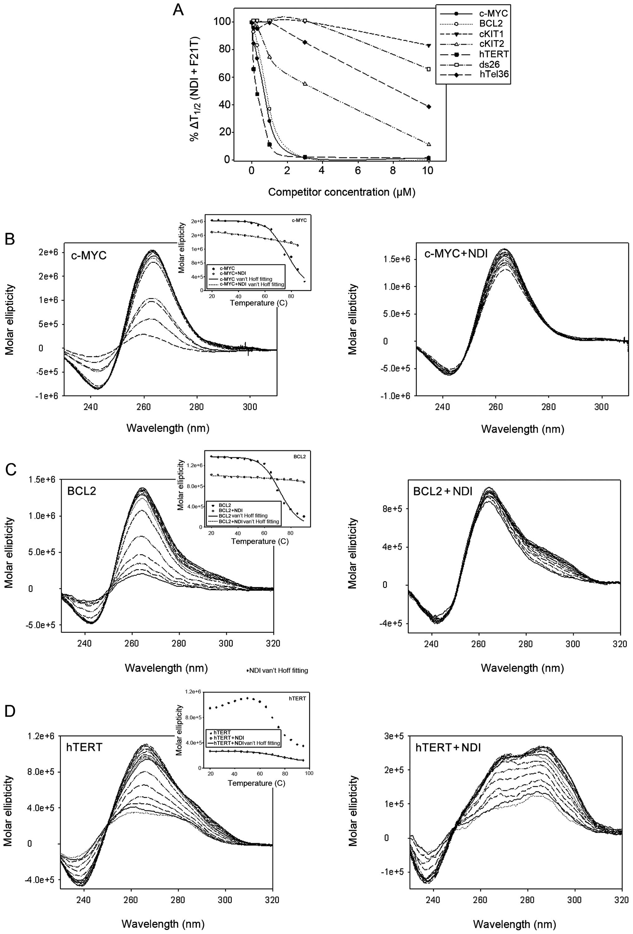 The binding properties of H-NDI-NMe2 were investigated towards a panel of G-4-forming oligonucleotides, corresponding to the promoter regions of MYC, BCL2, KIT (KIT1 and KIT2) and TERT (Table I) and compared to the binding properties against the telomeric sequence (hTel22) (Table I) which have been previously acquired (21).