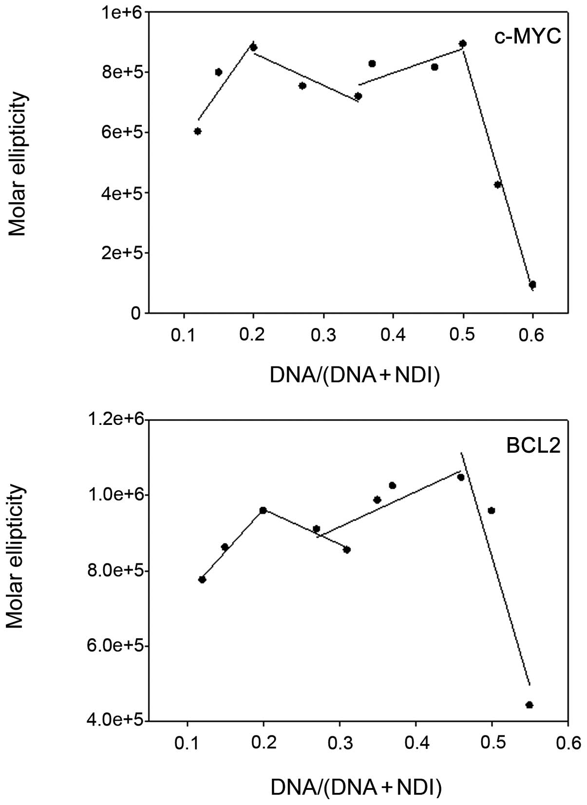 Binding stoichiometry was determined by the continuous variation method (Job plot). Solutions of MYC or BCL2 and H-NDI-NMe2 were mixed in different proportions maintaining a total concentration of DNA + H-NDI-NMe2 of 10 μM. The mole fractions for DNA/(DNA + H-NDI-NMe2) were 0.12, 0.15, 0.20, 0.27, 0.31, 0.35, 0.37, 0.46, 0.50, 0.55, 0.60. The mole fraction of the DNA was plotted against the molar ellipticity at 290 nm of the DNA + H-NDI-NMe2 complex. In the plot, the mole fraction of the DNA at which the molar ellipticity of the DNA + H-NDI-NMe2 complex is maximum, gives the stoichiometry of the complex. The number of H-NDI-NMe2 binding sites is equivalent to (1 - x)/x, where x is the DNA fraction at the intersection of the two fitting straight lines. All samples were allowed to equilibrate overnight. A buffer baseline was collected in the same cuvette and subtracted from the sample spectra.