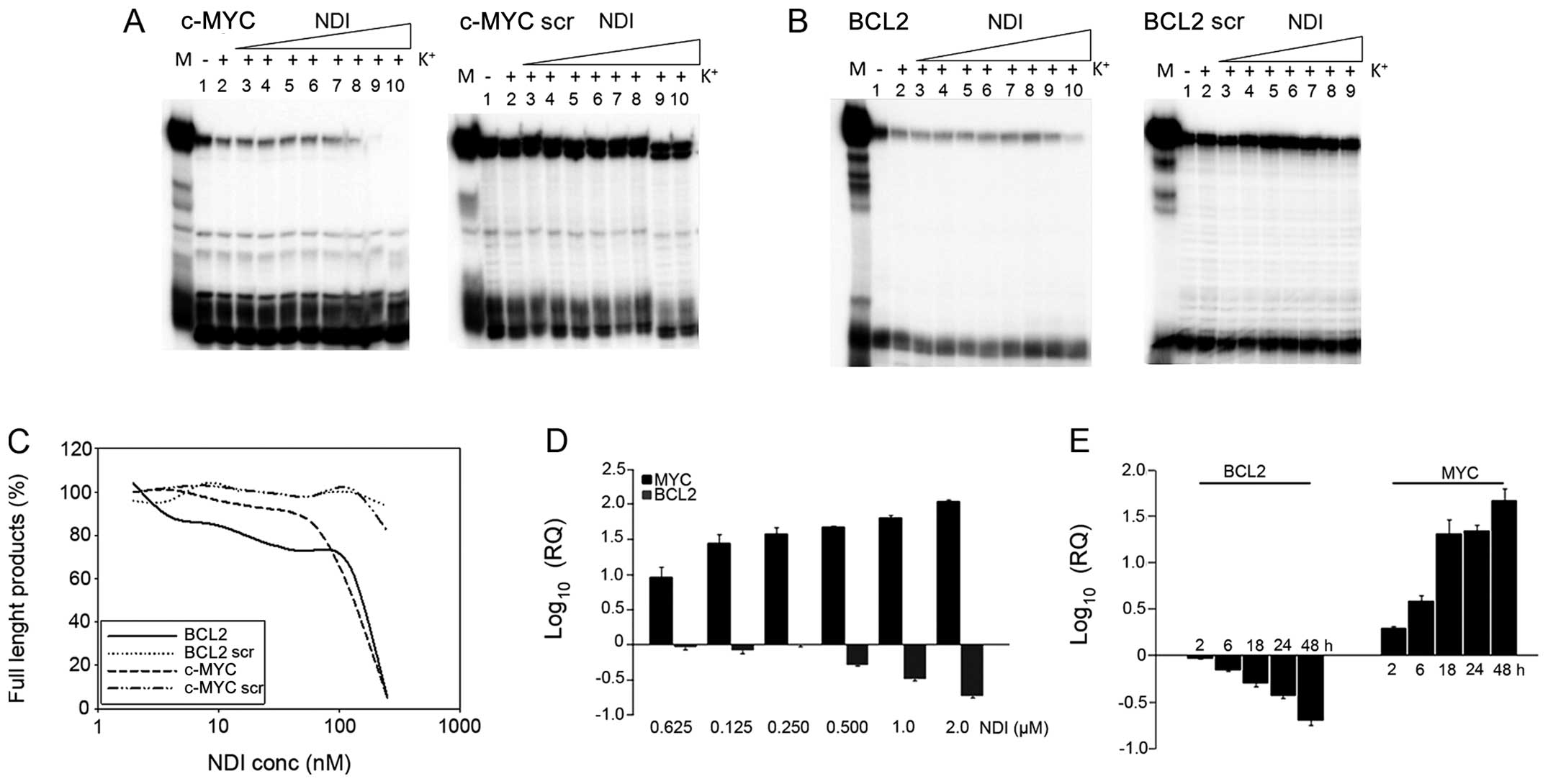 Further evidence of MYC and BCL2 G-4 stabilization by H-NDI-NMe2 was provided by the Taq polymerase stop assay. Because primers were designed to anneal in part to the G-rich sequence involved in G-4 formation, inhibition of the full-length primer-extended product was expected upon G-4 folding. As shown in Fig. 4, the strong inherent MYC and BCL2 G-4 stability in the presence of K+ partly impaired enzyme processing, even in the absence of NDI. Indeed, MYC and BCL2 full-length products were remarkably less in the wild-type compared to scrambled templates, used as controls to check for the possible G4-independent inhibition of Taq polymerase mediated by H-NDI-NMe2 (Fig. 4A and B, lane 2). Similarly, in the absence of K+, full-length run-offs were less abundant in wild-type than in scrambled templates (Fig. 4A and B, lane 1), even though this effect was more evident for MYC than BCL2, thus confirming the ability of the MYC sequence to fold into G-4 independently of K+. In addition, a dose-dependent inhibition of the full-length products was observed in the G-4-forming templates when the assay was performed in the presence of increasing concentrations of H-NDI-NMe2 (Fig. 4A and B, lanes 1–9/10). Interestingly, at 50 and 100 nM H-NDI-NMe2 no full-length product formed in MYC and BCL2, respectively (Fig. 4A–C), indicating an extremely efficient stabilization of the MYC and BCL2 G-4 topologies upon H-NDI-NMe2 binding.