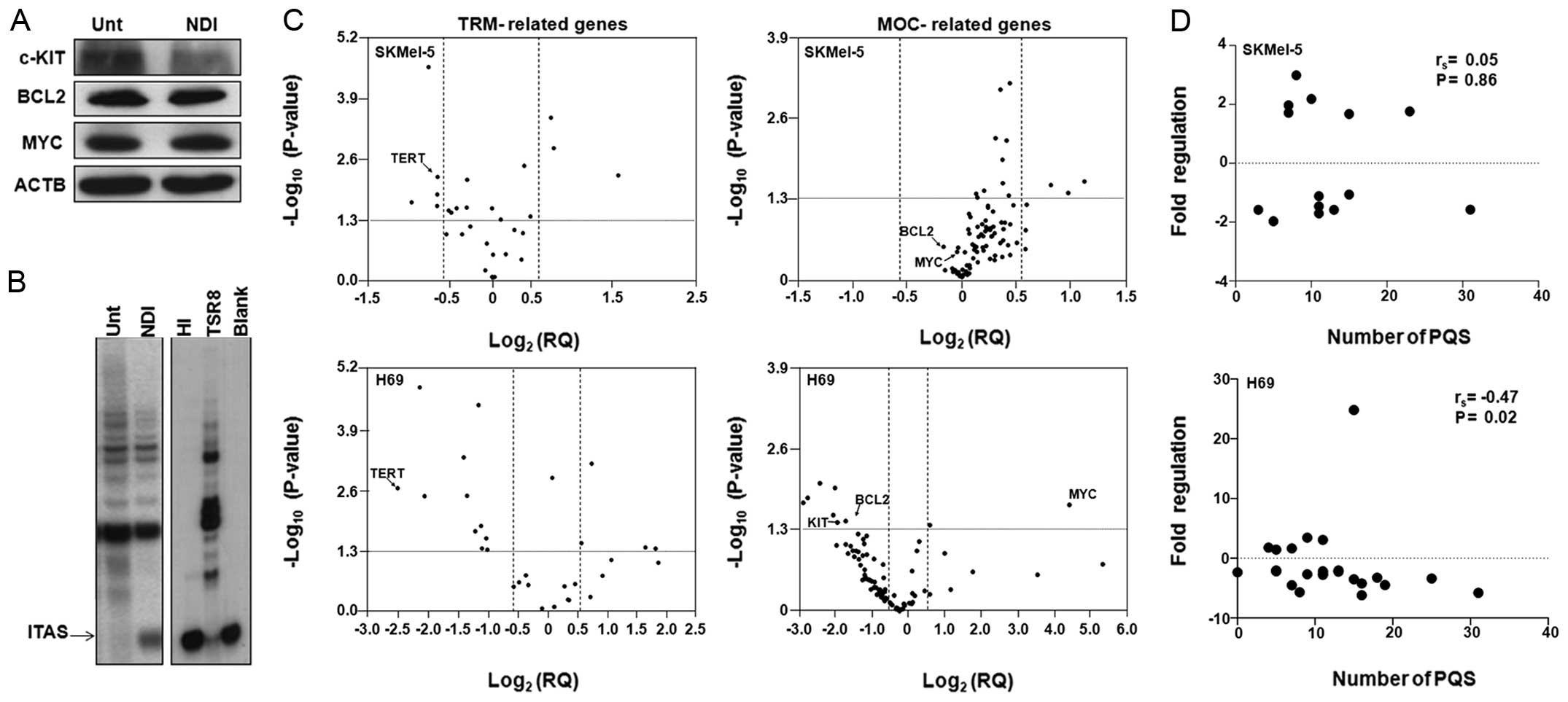 To test such a hypothesis, we investigated the gene expression profiles in both tumor cell lines following exposure to H-NDI-NMe2. Specifically, we focused on commercially available TaqMan® Array containing 28 genes related to the TRM and 92 genes associated to the molecular mechanisms of cancer (MOC). Results showed that nine out of 28 (32.1%) TRM-related genes were significantly modulated in SKMel-5 cells (Fig. 5C): three genes, known as components of the shelterin complex (TERF1, TERF2 and TER2IP) were upregulated (Table III) and six genes were downregulated. Among the down-modulated genes we found TERT, thus confirming the data obtained using single assays, as well as GUSB, HMBS, MRE11A, HNRNPA1 and HNRNPA2B1 (Table III). However, a more marked perturbation in gene expression was observed in NDI-treated H69 cells than in SKMel-5 cells, further corroborating our previous observation (Fig. 1). Specifically, we identified 15 out of 28 (53.6%) differentially expressed genes in the panel of TRM-related genes in NDI-treated H69 cells compared to untreated cells. In particular, four (i.e., B2M, POT1, TERF1 and TFRC) and 11 (TERT, NBN, RAD50, HMBS, HNRNPF, HNRNPAB, HNRNPA1, HNRNPD, ACTB, GUSB and RPLPO) genes were found significantly up- and downregulated, respectively, in treated cells. Of note, housekeeping genes present in the array (i.e., ACTB, GUSB and RPLPO) were found modulated after NDI-treatment in both cell lines. This is not surprising since all three housekeeping genes are predicted to contain one or more putative quadruplex forming sequences (PQS) within their promoter region, as evidenced by two different in silico PQS prediction tools (Table III).