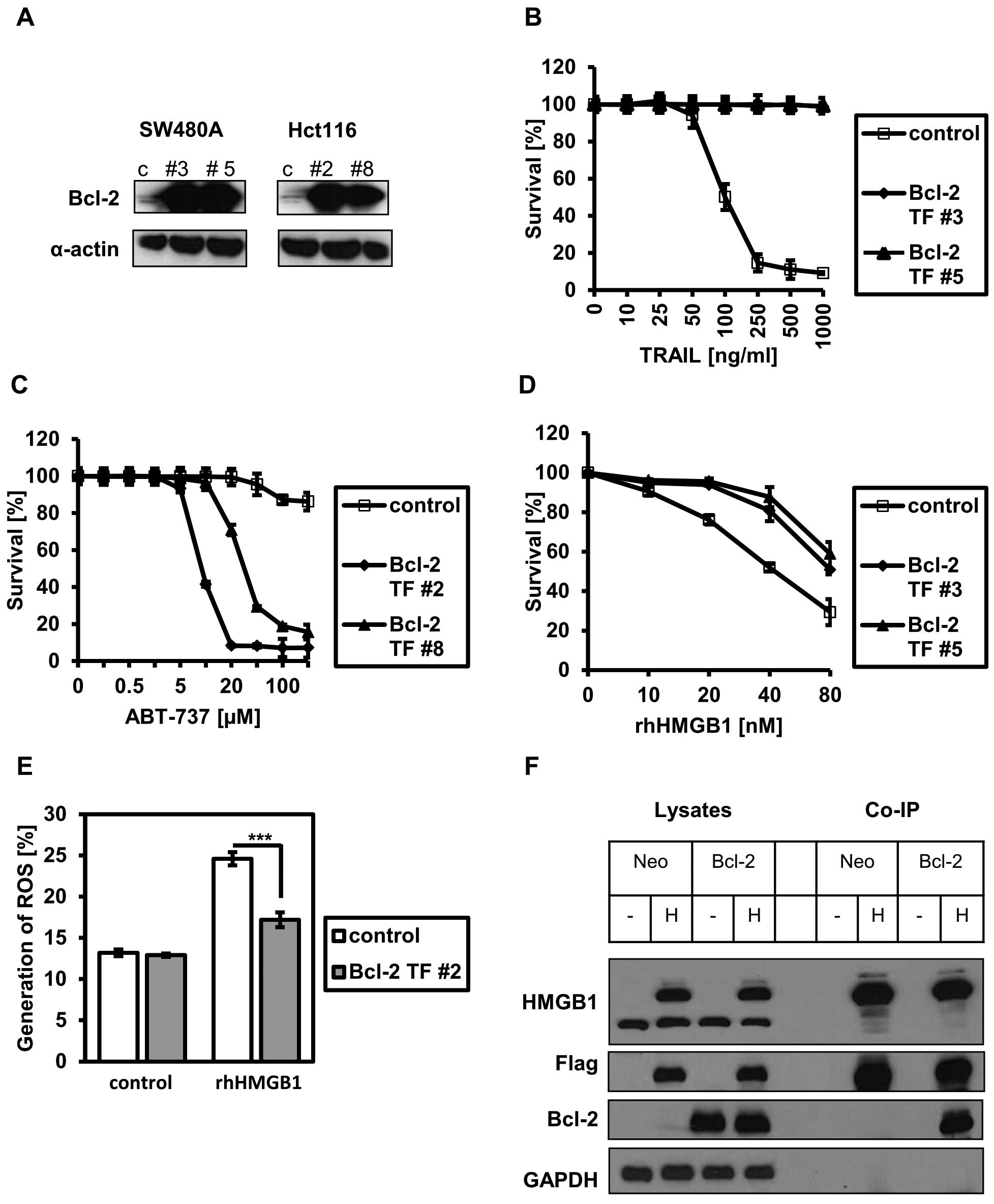 HMGB1 elicits in both glioblastoma cells (16) and in CRC cells (Fig. 1E) a significant increase in ROS. Therefore, we wondered whether the Bcl-2 protein, which stabilizes the outer mitochondrial membrane and prevents its permeabilization (24) would protect cells from HMGB1 cytotoxicity. To this end we created stably Bcl-2 overexpressing transfectants in the CRC cell lines SW480A and Hct116 (Fig. 2A). To confirm the functionality of overexpressed Bcl-2 we treated the cells with the death ligand TRAIL and the Bcl-2 family inhibitor ABT-737 (25). The Bcl-2 overexpressing CRC cells were completely resistant to the pro-apoptotic effects of TRAIL (Fig. 2B). In contrast, Bcl-2-transfected CRC cells turned out to be more susceptible to the cytotoxic activity of ABT-737 (Fig. 2C). This is in accordance with our earlier findings suggesting that a rapid release of pre-bound Bax from Bcl-2 can sensitize Bcl-2-overexpressing cells to ABT-737 (26). Next, we treated the CRC Bcl-2 transfectants with recombinant HMGB1 and observed a significant Bcl-2 dependent resistance (Fig. 2D). This resistance was paralleled by a substantially decreased generation of ROS in Bcl-2-overexpressing CRC cells (Fig. 2E). In an attempt to clarify how Bcl-2 can interfere with HMGB1-induced ROS release we tested whether HMGB1 can physically interact with Bcl-2. A co-immunprecipitation experiment using transiently overexpressed HMGB1 in stably overexpressing Bcl-2 cells suggested that both proteins bind to each other (Fig. 2F).