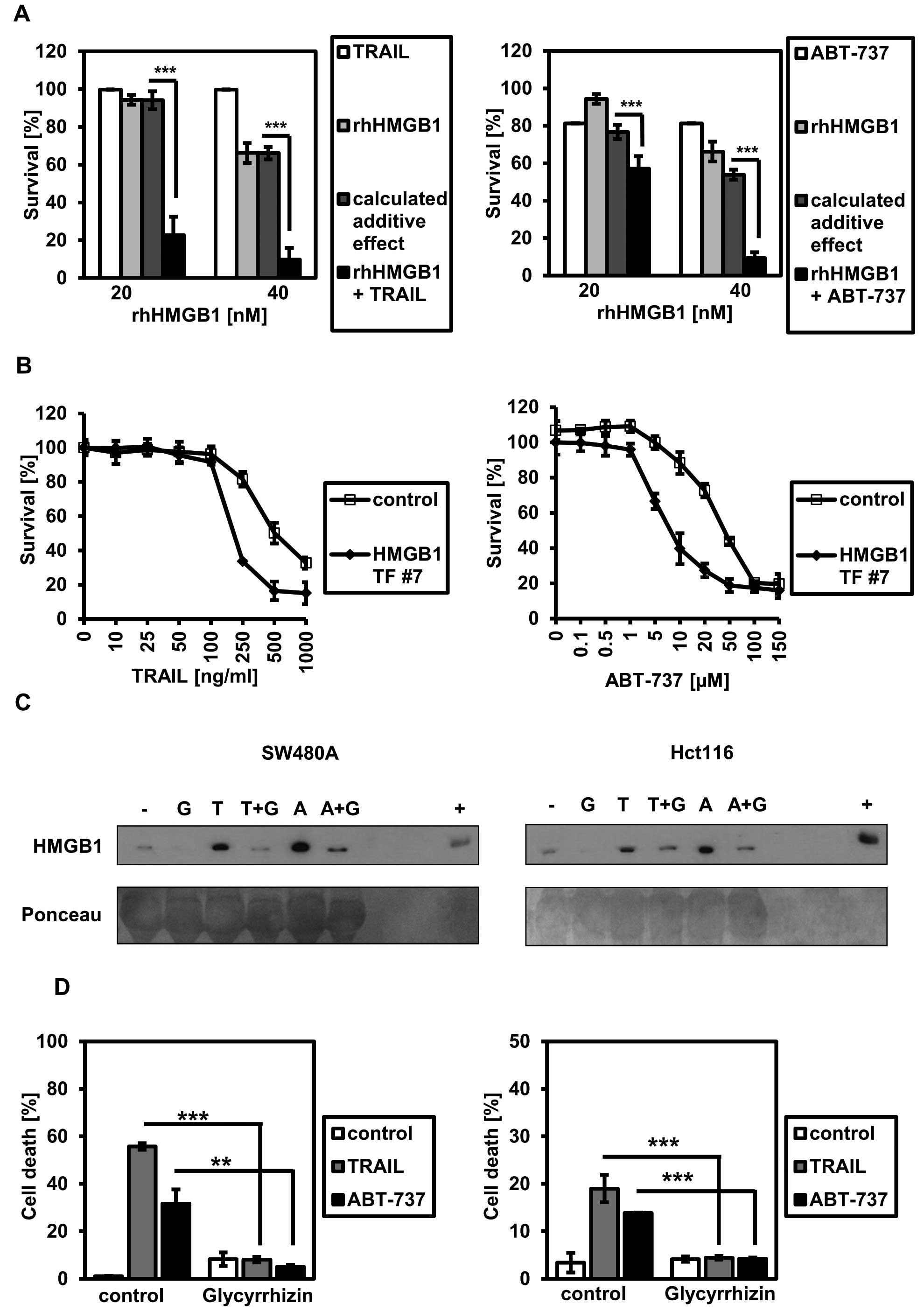 In general, non-redundant cell death pathways can synergistically interact. Thus, we investigated the effects of a combined triggering of non-apoptotic and apoptotic cell death pathways by HMGB1 and TRAIL or ABT-737, respectively. Recombinant HMGB1 strongly potentiated TRAIL-induced cell death (Fig. 3A, left panel). Similarly, HMGB1 sensitized CRC cells to the cytotoxic effects of ABT-737 (Fig. 3A, right panel). A similar sensitizing effect was achieved when HMGB1 was endogenously overexpressed in CRC cells instead of incubating cells with recombinant HMGB1 (Fig. 3B). Next, we were interested whether TRAIL- or ABT-737-induced cell death by itself is associated with release of endogenous HMGB1. In fact, treatment of CRC cells with either TRAIL or ABT-737 induced a strong release of endogenous HMGB1 into the cell culture supernatant (Fig. 3C). The HMGB1 release could be blocked by the HMGB1 inhibitor glycyrrhizin. Consequently, we also tested whether this TRAIL- and ABT-737-dependent HMGB1 release contributes to the cytotoxic activity of these compounds. Importantly, the HMGB1 inhibitor glycyrrhizin was capable of substantially decreasing the cytotoxicity of TRAIL and ABT-737 (Fig. 3D), indicating that HMGB1 release contributes to the cytotoxic activity of these pro-apoptotic agents.